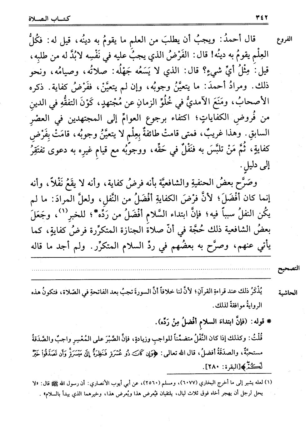 قَالَ أَحْمَدُ: وَيَجِبُ أَنْ يَطْلُبَ مِنْ الْعِلْمِ مَا يَقُومُ بِهِ دِينُهُ، قِيلَ لَهُ: فَكُلُّ الْعِلْمِ يَقُومُ بِهِ دِينُهُ، قَالَ: الْفَرْضُ الَّذِي يَجِبُ عَلَيْهِ فِي نَفْسِهِ لَا بُدَّ لَهُ مِنْ طَلَبِهِ، قِيلَ مِثْلُ أَيِّ شَيْءٍ؟ قَالَ الَّذِي لَا يَسَعُهُ جَهْلُهُ: صَلَاتُهُ، وَصِيَامُهُ، وَنَحْوُ ذَلِكَ، وَمُرَادُ أَحْمَدَ مَا يَتَعَيَّنُ وُجُوبُهُ، وَإِنْ لَمْ يَتَعَيَّنْ فَفَرْضُ كِفَايَةٍ، وَذَكَرَهُ الْأَصْحَابُ وَمَنَعَ الْآمِدِيُّ فِي خُلُوِّ الزَّمَانِ عَنْ مُجْتَهِدٍ كَوْنَ التَّفَقُّهِ فِي الدِّينِ مِنْ فُرُوضِ الْكِفَايَاتِ؛ اكْتِفَاءً بِرُجُوعِ الْعَوَامّ إلَى الْمُجْتَهِدِينَ فِي الْعَصْرِ السَّابِقِ، وَهَذَا غَرِيبٌ، فَمَتَى قَامَتْ طَائِفَةٌ بِمَا لَا يَتَعَيَّنُ وُجُوبُهُ قَامَتْ بِفَرْضِ كِفَايَةٍ ثُمَّ مَنْ تَلَبَّسَ بِهِ نَفْلٌ فِي حَقِّهِ، وَوُجُوبُهُ مَعَ قِيَامِ غَيْرِهِ دَعْوَى تَفْتَقِرُ إلَى دَلِيلٍ.