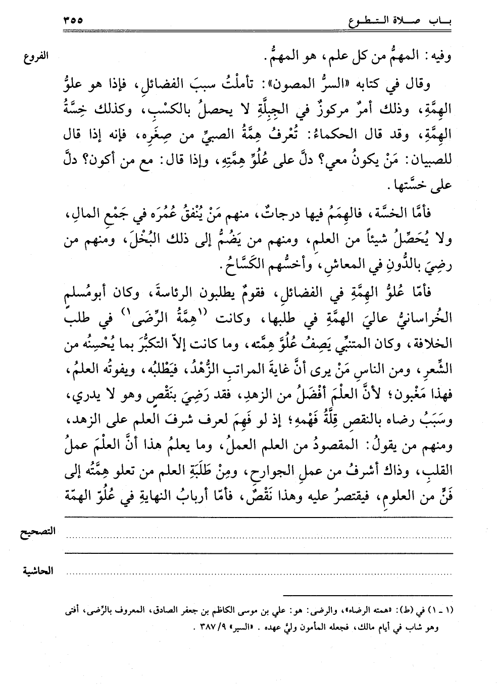 فَأَمَّا عُلُوُّ الْهِمَّةِ فِي الْفَضَائِلِ فَقَوْمٌ يَطْلُبُونَ الرِّئَاسَةَ، وَكَانَ أَبُو مُسْلِمٍ الْخُرَاسَانِيُّ عَالِي الْهِمَّةِ فِي طَلَبِهَا، وَكَانَتْ "1هِمَّتُهُ الرِّضَاءَ1" فِي طَلَبِ الْخِلَافَةِ، وَكَانَ الْمُتَنَبِّي يَصِفُ عُلُوَّ هِمَّتِهِ، وَمَا كَانَتْ إلَّا التَّكَبُّرَ بِمَا يُحْسِنُهُ مِنْ الشِّعْرِ، وَمِنْ النَّاسِ مَنْ يَرَى أَنَّ غَايَةَ الْمَرَاتِبِ الزُّهْدُ فَيَطْلُبُهُ، وَيَفُوتُهُ الْعِلْمُ، فَهَذَا مَغْبُونٌ، لِأَنَّ الْعِلْمَ أَفْضَلُ مِنْ الزُّهْدِ، فَقَدْ رَضِيَ بِنَقْصٍ وَهُوَ لَا يَدْرِي، وَسَبَبُ رِضَاهُ بِالنَّقْصِ قِلَّةُ فَهْمِهِ، إذْ لَوْ فَهِمَ لَعَرَفَ شَرَفَ الْعِلْمِ عَلَى الزُّهْدِ، وَمِنْهُمْ مَنْ يَقُولُ: الْمَقْصُودُ مِنْ الْعِلْمِ الْعَمَلُ، وَمَا يَعْلَمُ هَذَا أَنَّ الْعِلْمَ عَمَلُ الْقَلْبِ، وَذَاكَ أَشْرَفُ مِنْ عَمَلِ الْجَوَارِحِ، وَمِنْ طَلَبَةِ الْعِلْمِ مَنْ تَعْلُو هِمَّتُهُ إلَى فَنٍّ مِنْ الْعُلُومِ فَيَقْتَصِرُ عَلَيْهِ وَهَذَا نَقْصٌ، فَأَمَّا أَرْبَابُ النِّهَايَةِ في علو الهمة