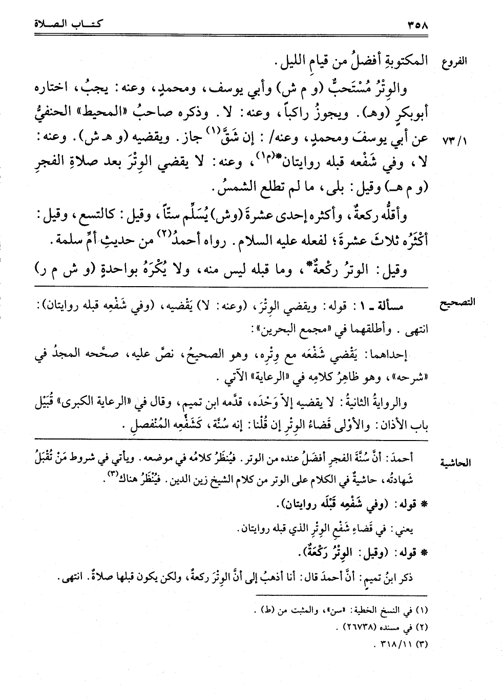 وَالْوِتْرُ مُسْتَحَبٌّ "وم ش" وَأَبِي يُوسُفَ، وَمُحَمَّدٍ، وَعَنْهُ يَجِبُ، اخْتَارَهُ أبو بكر "وهـ" وَيَجُوزُ رَاكِبًا، وَعَنْهُ لَا، وَذَكَرَهُ صَاحِبُ الْمُحِيطِ الْحَنَفِيُّ عَنْ أَبِي يُوسُفَ وَمُحَمَّدٍ، وَعَنْهُ إنْ شق1 جاز. ويقضيه "وهـ ش" وَعَنْهُ لَا، وَفِي شَفْعِهِ قَبْلَهُ رِوَايَتَانِ "م 1" وَعَنْهُ لَا يَقْضِي الْوِتْرَ بَعْدَ صَلَاةِ الفجر "وم هـ" وَقِيلَ: بَلَى مَا لَمْ تَطْلُعْ الشَّمْسُ.