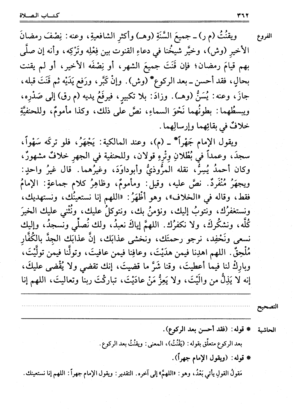 وَيَقُولُ الْإِمَامُ جَهْرًا "و" وَعِنْدَ الْمَالِكِيَّةِ بِجَهْرٍ، فَلَوْ تَرَكَهُ سَهْوًا سَجَدَ، وَعَمْدًا فِي بُطْلَانِ وِتْرِهِ قَوْلَانِ، وَلِلْحَنَفِيَّةِ فِي الْجَهْرِ خِلَافٌ مَشْهُورٌ، وَكَانَ أَحْمَدُ يُسِرُّ، نَقَلَهُ الْمَرُّوذِيُّ وَأَبُو دَاوُد، وَغَيْرُهُمَا، قَالَ غَيْرُ وَاحِدٍ: وَيَجْهَرُ مُنْفَرِدٌ نَصَّ عَلَيْهِ، وَقِيلَ: وَمَأْمُومٌ، وَظَاهِرُ كَلَامِ جَمَاعَةٍ: الْإِمَامُ فَقَطْ، وَقَالَهُ فِي الْخِلَافِ وَهُوَ أَظْهَرُ "اللَّهُمَّ إنَّا نَسْتَعِينُك، وَنَسْتَهْدِيك، وَنَسْتَغْفِرُك، وَنَتُوبُ إلَيْك، وَنُؤْمِنُ بِك، وَنَتَوَكَّلُ عَلَيْك، وَنُثْنِي عَلَيْك الْخَيْرَ كُلَّهُ، وَنَشْكُرُك، وَلَا نَكْفُرُك، اللَّهُمَّ إيَّاكَ نَعْبُدُ، وَلَك نُصَلِّي وَنَسْجُدُ، وَإِلَيْك نَسْعَى وَنَحْفِدُ. نَرْجُو رَحْمَتَك، وَنَخْشَى عَذَابَك. إنَّ عَذَابَك الْجِدَّ بِالْكُفَّارِ مُلْحَقٌ، اللَّهُمَّ اهْدِنَا فِيمَنْ هَدَيْت، وَعَافِنَا فِيمَنْ عَافَيْت، وَتَوَلَّنَا فِيمَنْ تَوَلَّيْت، وَبَارِكْ لَنَا فِيمَا أَعْطَيْت، وَقِنَا شَرَّ مَا قَضَيْت، إنَّك تَقْضِي وَلَا يُقْضَى عَلَيْك، إنَّهُ لَا يَذِلُّ مَنْ وَالَيْت، وَلَا يَعِزُّ مَنْ عَادَيْت، تَبَارَكْت رَبَّنَا وَتَعَالَيْت، اللهم إنا