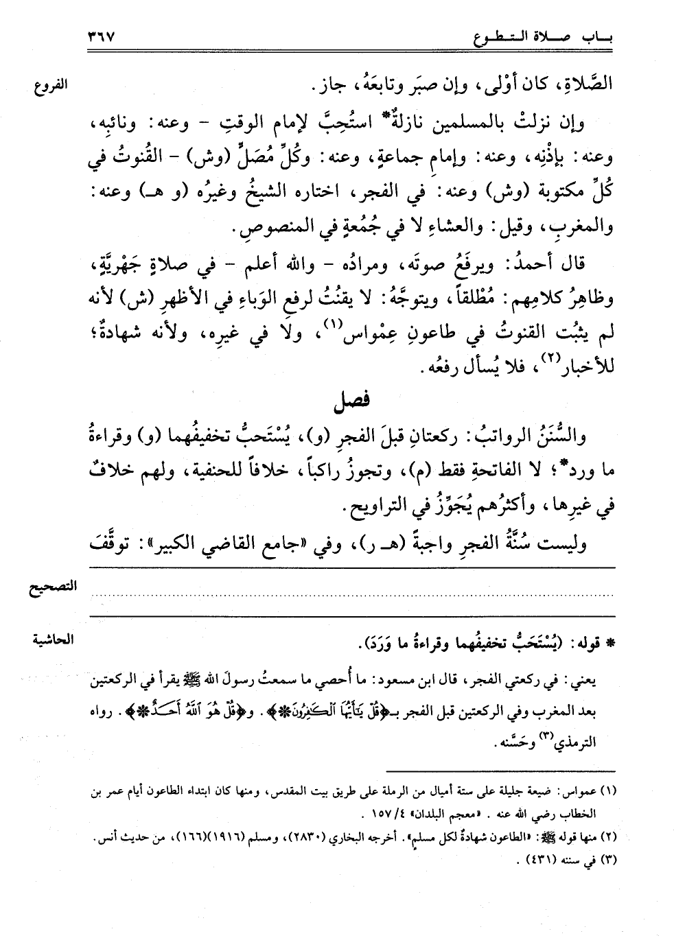 وَإِنْ نَزَلَتْ بِالْمُسْلِمِينَ نَازِلَةٌ اُسْتُحِبَّ لِإِمَامٍ الْوَقْتُ. وَعَنْهُ وَنَائِبِهِ وَعَنْهُ بِإِذْنِهِ وَعَنْهُ وَإِمَامِ جَمَاعَةٍ، وعنه، وكل مصل "وش" القنوت في كل مكتوبة "وش" وعنه في الفجر، اختاره الشيخ وغيره "وهـ" وَعَنْهُ وَالْمَغْرِبِ، وَقِيلَ وَالْعِشَاءِ لَا فِي جُمُعَةٍ فِي الْمَنْصُوصِ. قَالَ أَحْمَدُ: وَيَرْفَعُ صَوْتَهُ، وَمُرَادُهُ وَاَللَّهُ أَعْلَمُ فِي صَلَاةٍ جَهْرِيَّةٍ، وَظَاهِرُ كَلَامِهِمْ مُطْلَقًا، وَيُتَوَجَّهُ لَا يَقْنُتُ لِدَفْعِ الْوَبَاءِ فِي الْأَظْهَرِ "ش" لِأَنَّهُ لَمْ يَثْبُتْ الْقُنُوتُ فِي طَاعُونِ عَمَوَاسَ1، وَلَا فِي غَيْرِهِ، وَلِأَنَّهُ شَهَادَةٌ للأخبار2، فلا يسأل رفعه.