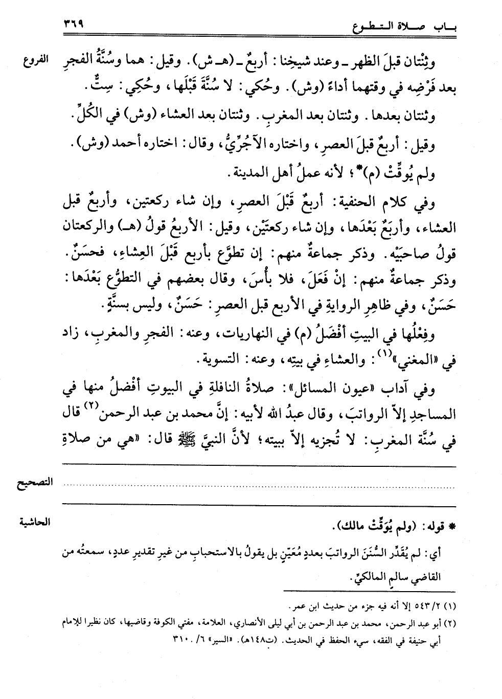 وَفِي كَلَامِ الْحَنَفِيَّةِ أَرْبَعٌ قَبْلَ الْعَصْرِ، وَإِنْ شَاءَ رَكْعَتَيْنِ، وَأَرْبَعٌ قَبْلَ الْعِشَاءِ، وَأَرْبَعٌ بَعْدَهَا، وَإِنْ شَاءَ رَكْعَتَيْنِ، وَقِيلَ الْأَرْبَعُ قَوْلُ "هـ" وَالرَّكْعَتَانِ قَوْلُ صَاحِبَيْهِ، وَذَكَرَ جَمَاعَةٌ مِنْهُمْ إنْ تَطَوَّعَ بِأَرْبَعٍ قَبْلَ الْعِشَاءِ فَحَسَنٌ، وَذَكَرَ جَمَاعَةٌ مِنْهُمْ إنْ فَعَلَ فَلَا بَأْسَ، وَقَالَ بَعْضُهُمْ فِي التَّطَوُّعِ بَعْدَهَا حَسَنٌ. وَفِي ظَاهِرِ الرِّوَايَةِ فِي الْأَرْبَعِ قَبْلَ الْعَصْرِ حَسَنٌ، وَلَيْسَ بِسُنَّةٍ. وَفِعْلُهَا فِي الْبَيْتِ أَفْضَلُ "م" فِي النَّهَارِيَّاتِ، وَعَنْهُ الْفَجْرِ وَالْمَغْرِبِ، زَادَ فِي الْمُغْنِي1 وَالْعِشَاءُ فِي بَيْتِهِ وَعَنْهُ التَّسْوِيَةُ.