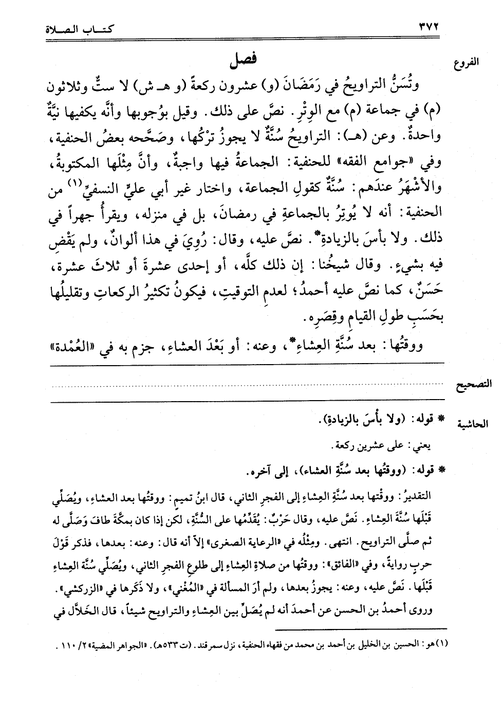 "و" عِشْرُونَ رَكْعَةً "وهـ ش" لَا سِتٌّ وَثَلَاثُونَ "و" فِي جَمَاعَةٍ "م" مَعَ الْوِتْرِ نَصَّ عَلَى ذَلِكَ، وَقِيلَ بِوُجُوبِهَا وَأَنَّهُ يَكْفِيهَا نِيَّةٌ وَاحِدَةٌ، وَعِنْدَ "هـ" التَّرَاوِيحُ سُنَّةٌ، لَا يَجُوزُ تَرْكُهَا، وَصَحَّحَهُ بَعْضُ الْحَنَفِيَّةِ. وَفِي جَوَامِعِ الْفِقْهِ لِلْحَنَفِيَّةِ. الْجَمَاعَةُ فِيهَا وَاجِبَةٌ، وَأَنَّ مِثْلَهَا الْمَكْتُوبَةُ وَالْأَشْهَرُ عِنْدَهُمْ سُنَّةٌ كَقَوْلِ الْجَمَاعَةِ، وَاخْتَارَ غَيْرُ أَبِي عَلِيٍّ النَّسَفِيِّ1 مِنْ الْحَنَفِيَّةِ أَنَّهُ لَا يُوتِرُ بِالْجَمَاعَةِ فِي رَمَضَانَ، بَلْ فِي مَنْزِلِهِ، وَيَقْرَأُ جَهْرًا فِي ذَلِكَ، وَلَا بَأْسَ بِالزِّيَادَةِ نَصَّ عَلَيْهِ، وَقَالَ: رُوِيَ فِي هَذَا أَلْوَانٌ، وَلَمْ يَقْضِ فِيهِ بِشَيْءٍ، وَقَالَ شَيْخُنَا إنَّ ذَلِكَ كُلَّهُ، أَوْ إحْدَى عَشْرَةَ، أَوْ ثَلَاثَ عَشْرَةَ حَسَنٌ، كَمَا نَصَّ عَلَيْهِ أَحْمَدُ لِعَدَمِ التَّوْقِيتِ، فَيَكُونُ تَكْثِيرُ الرَّكَعَاتِ، وَتَقْلِيلُهَا بِحَسَبِ طُولِ الْقِيَامِ وَقِصَرِهِ.