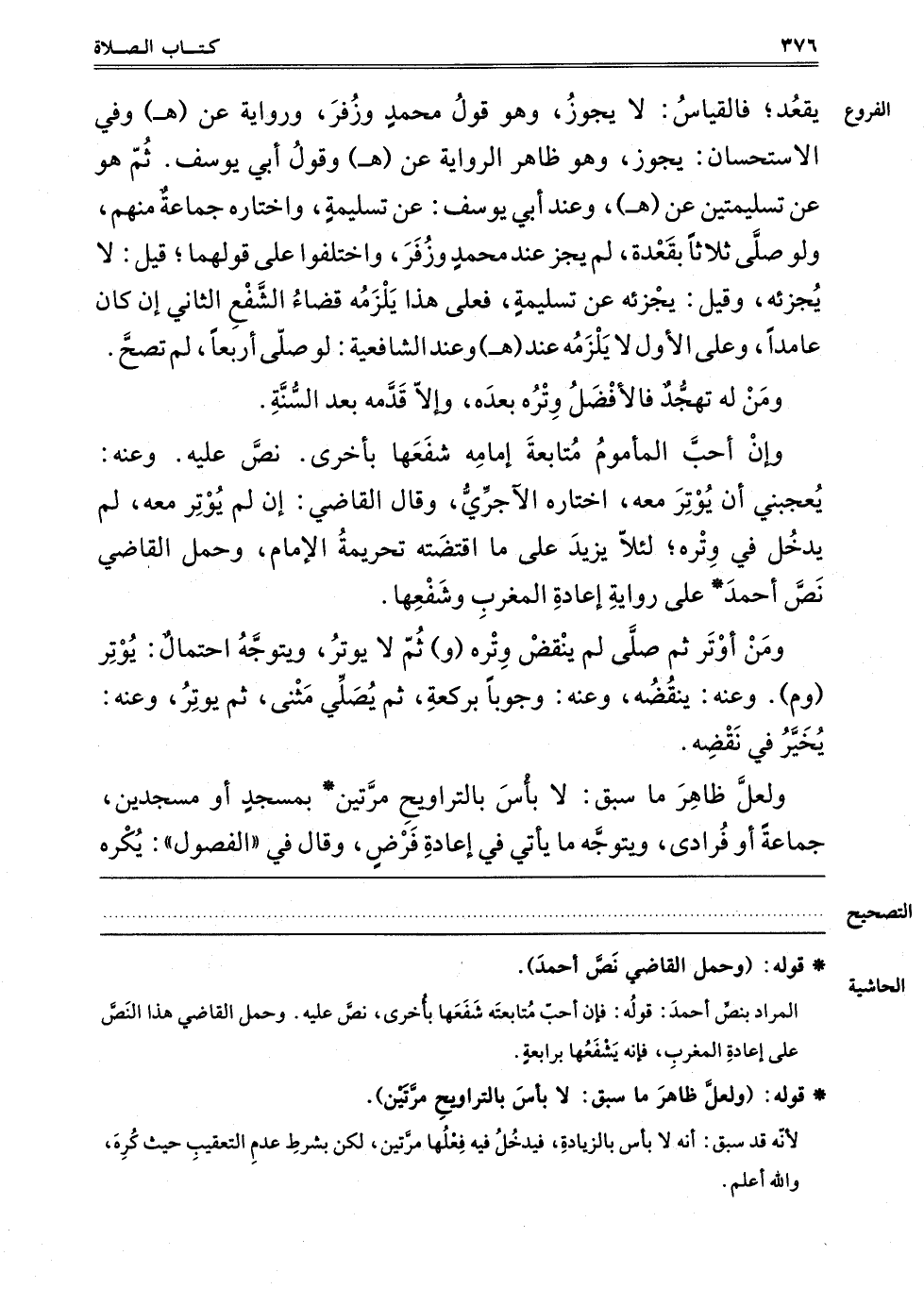يَقْعُدْ فَالْقِيَاسُ لَا يَجُوزُ، وَهُوَ قَوْلُ مُحَمَّدٍ وَزُفَرَ، وَرِوَايَةٌ عَنْ "هـ" وَفِي الِاسْتِحْسَانِ يَجُوزُ وَهُوَ ظَاهِرُ الرِّوَايَةِ عَنْ "هـ" وَقَوْلُ أَبِي يُوسُفَ ثُمَّ هُوَ عَنْ تَسْلِيمَتَيْنِ "هـ" وَعَنْ أَبِي يُوسُفَ عَنْ تَسْلِيمَةٍ، وَاخْتَارَهُ جَمَاعَةٌ مِنْهُمْ، وَلَوْ صَلَّى ثَلَاثًا بِقَعْدَةٍ لَمْ يُجْزِ عِنْدَ مُحَمَّدٍ وَزُفَرَ، وَاخْتَلَفُوا عَلَى قَوْلِهِمَا: قِيلَ لَا يُجْزِئُهُ، وَقِيلَ يُجْزِيهِ عَنْ تَسْلِيمَةٍ، فَعَلَى هَذَا يَلْزَمُهُ قَضَاءُ الشَّفْعِ الثَّانِي، إنْ كَانَ عَامِدًا، وَعَلَى الْأَوَّلِ لَا يَلْزَمُهُ عِنْدَ "هـ" وَعِنْدَ الشَّافِعِيَّةِ لَوْ صَلَّى أَرْبَعًا لَمْ تَصِحَّ. وَمَنْ لَهُ تَهَجُّدٌ فَالْأَفْضَلُ وِتْرُهُ بَعْدَهُ، وَإِلَّا قَدَّمَهُ بَعْدَ السُّنَّةِ.