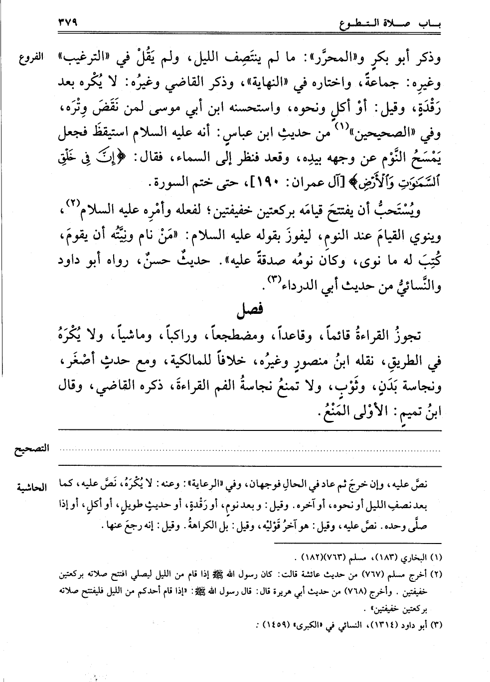 وَذَكَرَ أَبُو بَكْرٍ وَالْمُحَرَّرِ مَا لَمْ يَنْتَصِفْ اللَّيْلُ، وَلَمْ يَقُلْ فِي التَّرْغِيبِ وَغَيْرِهِ جَمَاعَةً، وَاخْتَارَهُ فِي النِّهَايَةِ، وَذَكَرَ الْقَاضِي وَغَيْرُهُ لَا يُكْرَهُ بَعْدَ رَقْدَةٍ، وَقِيلَ أَوْ أَكْلٍ، وَنَحْوِهِ، وَاسْتَحْسَنَهُ ابْنُ أَبِي مُوسَى لِمَنْ يَقْضِ وِتْرَهُ. وَفِي الصَّحِيحَيْنِ1 مِنْ حَدِيثِ ابْنِ عَبَّاسٍ أَنَّهُ عَلَيْهِ السَّلَامُ اسْتَيْقَظَ فَجَعَلَ يَمْسَحُ النَّوْمَ عَنْ وَجْهِهِ بِيَدِهِ، وَقَعَدَ فَنَظَرَ إلَى السَّمَاءِ فَقَالَ {إِنَّ فِي خَلْقِ السَّمَاوَاتِ وَالْأَرْضِ} [آل عمران: 190] حَتَّى خَتَمَ السُّورَةَ.