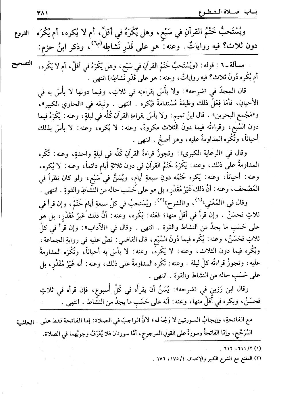 ـــــــــــــــــــــــــــــQمَسْأَلَةٌ 6: قَوْلُهُ وَيُسْتَحَبُّ خَتْمُ الْقُرْآنِ فِي سَبْعٍ، وهل يكره في أقل، أم لَا يُكْرَهُ، أَمْ يُكْرَهُ دُونَ ثَلَاثٍ، فِيهِ رِوَايَاتٌ، وَعَنْهُ هُوَ عَلَى قَدْرِ نَشَاطِهِ، انْتَهَى.