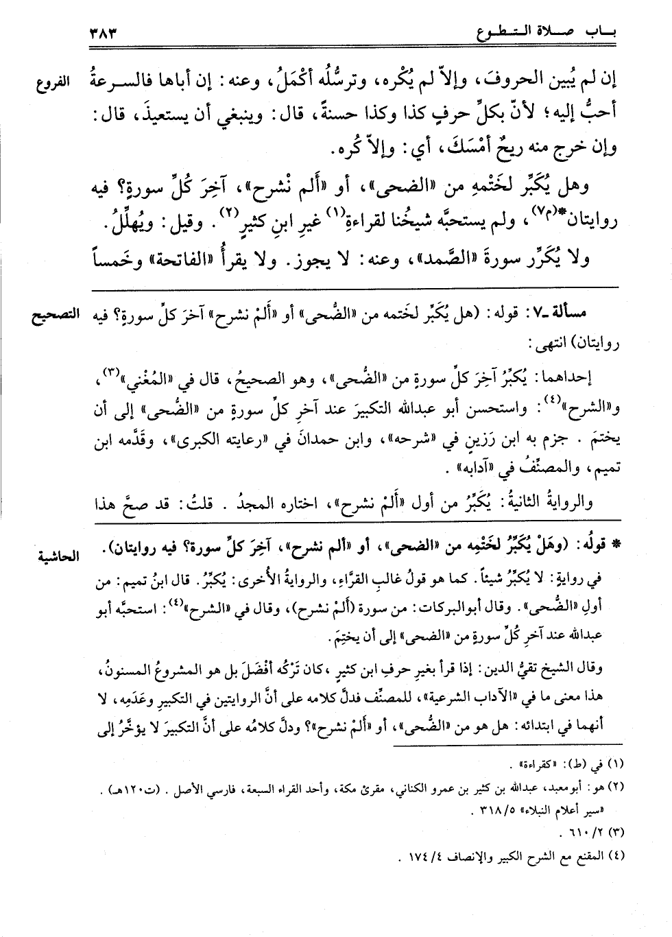 وَهَلْ يُكَبِّرُ لِخَتْمِهِ مِنْ الضُّحَى أَوْ أَلَمْ نَشْرَحْ آخِرَ كُلِّ سُورَةٍ؟ فِيهِ رِوَايَتَانِ "م 7" وَلَمْ يستحبه شيخنا لقراءة1 غَيْرِ ابْنِ كَثِيرٍ2. وَقِيلَ وَيُهَلِّلُ، وَلَا يُكَرِّرُ سُورَةَ الصَّمَدِ وَعَنْهُ لَا يَجُوزُ، وَلَا يَقْرَأُ الفاتحة وخمسا