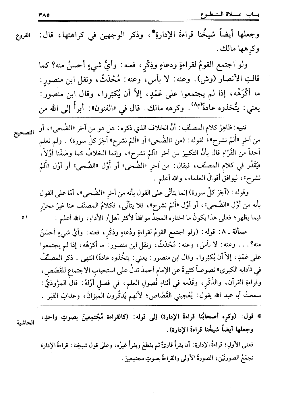 وجعلها أيضا شيخنا قراءة الْإِدَارَةِ وَذَكَرَ الْوَجْهَيْنِ فِي كُرْهِهَا، قَالَ: وَكَرِهَهَا مالك.