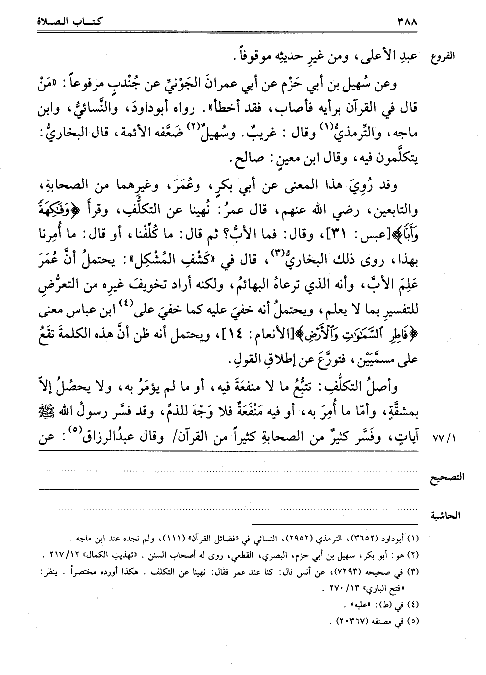 وَعَنْ سُهَيْلِ بْنِ حَزْمٍ عَنْ أَبِي عِمْرَانَ الْجَوْنِيِّ عَنْ جُنْدُبٍ مَرْفُوعًا: "مَنْ قَالَ فِي الْقُرْآنِ بِرَأْيِهِ فَقَدْ أَخْطَأَ". رَوَاهُ أَبُو دَاوُد وَالنَّسَائِيُّ وَابْنُ مَاجَهْ وَالتِّرْمِذِيُّ1، وَقَالَ غَرِيبٌ وَسُهَيْلٌ2 ضَعَّفَهُ الْأَئِمَّةُ، قَالَ الْبُخَارِيُّ: يَتَكَلَّمُونَ فِيهِ. وَقَالَ ابْنُ مَعِينٍ: صَالِحٌ.