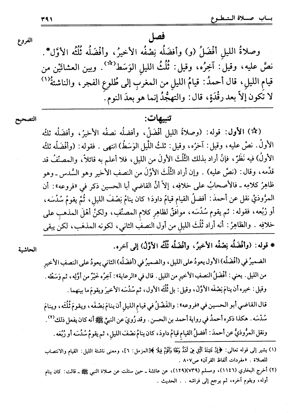 الْأَوَّلُ: قَوْلُهُ: وَصَلَاةُ اللَّيْلِ أَفْضَلُ، وَأَفْضَلُهُ نصفه الأخير، وأفضله ثلثه الأول نص عليه، وَقِيلَ آخِرُهُ، وَقِيلَ ثُلُثُ اللَّيْلِ الْوَسَطُ، انْتَهَى، فَقَوْلُهُ وَأَفْضَلُهُ ثُلُثُهُ الْأَوَّلُ فِيهِ نَظَرٌ، فَإِنْ أَرَادَ بِذَلِكَ الثُّلُثَ الْأَوَّلَ مِنْ اللَّيْلِ، فَلَا أَعْلَمُ بِهِ قَائِلًا، وَالْمُصَنِّفُ قَدْ قَدَّمَهُ، وَقَالَ نَصَّ عَلَيْهِ، وَإِنْ أَرَادَ الثُّلُثَ الْأَوَّلَ مِنْ النِّصْفِ الْأَخِيرِ وَهُوَ السُّدُسُ وَهُوَ ظَاهِرُ كَلَامِهِ فَالْأَصْحَابُ عَلَى خِلَافِهِ، إلَّا أَنَّ الْقَاضِيَ أَبَا الْحُسَيْنِ ذَكَرَ فِي فُرُوعِهِ أَنَّ الْمَرُّوذِيَّ نَقَلَ عَنْ أَحْمَدَ: أَفْضَلُ الْقِيَامِ قِيَامُ دَاوُد، كَانَ يَنَامُ نِصْفَ اللَّيْلِ، ثُمَّ يَقُومُ سُدُسَهُ، مُوَافِقٌ لِظَاهِرِ كَلَامِ الْمُصَنِّفِ لَكِنَّ أَهْلَ الْمَذْهَبِ عَلَى خِلَافِهِ، وَالظَّاهِرُ أَنَّهُ أَرَادَ ثُلُثَ اللَّيْلِ مِنْ أَوَّلِ النِّصْفِ الثَّانِي، لِكَوْنِهِ الْمَذْهَبَ، وَلَكِنْ يَبْقَى