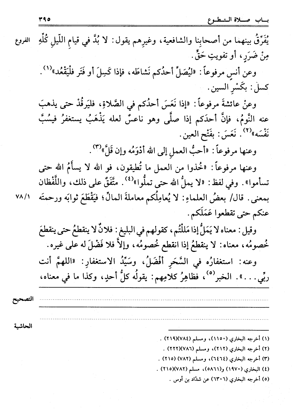 وَعَنْ عَائِشَةَ مَرْفُوعًا: إذَا نَعَسَ أَحَدُكُمْ فِي الصَّلَاةِ فَلْيَرْقُدْ حَتَّى يَذْهَبَ عَنْهُ النَّوْمُ، فَإِنَّ أَحَدَكُمْ إذَا صَلَّى وَهُوَ نَاعِسٌ لَعَلَّهُ يَذْهَبُ يَسْتَغْفِرُ فَيَسُبُّ نَفْسَهُ2. نَعَسَ بِفَتْحِ الْعَيْنِ، وَعَنْهَا مَرْفُوعًا: "أَحَبُّ الْعَمَلِ إلَى اللَّهِ تَعَالَى أَدْوَمُهُ وَإِنْ قَلَّ"3.