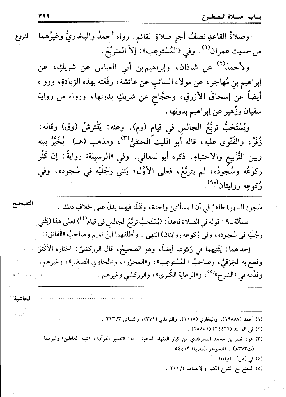مَسْأَلَةٌ 9: قَوْلُهُ: فِي الصَّلَاةِ قَاعِدًا يُسْتَحَبُّ تَرَبُّعُ الْجَالِسِ في قيام4، فَعَلَى هَذَا يَثْنِي رِجْلَيْهِ فِي سُجُودِهِ، وَفِي رُكُوعِهِ رِوَايَتَانِ، انْتَهَى، وَأَطْلَقَهُمَا ابْنُ تَمِيمٍ، وَصَاحِبُ الْفَائِقِ، إحْدَاهُمَا يَثْنِيهِمَا فِي رُكُوعِهِ، أَيْضًا وَهُوَ الصَّحِيحُ، قَالَ الزَّرْكَشِيّ اخْتَارَهُ الْأَكْثَرُ وَقَطَعَ بِهِ الْخِرَقِيُّ، وَصَاحِبُ الْمُسْتَوْعِبِ، وَالْمُحَرَّرِ، وَالْحَاوِي الصَّغِيرِ، وَغَيْرُهُمْ، وَقَدَّمَهُ فِي الشَّرْحِ5، وَالرِّعَايَةِ الْكُبْرَى، وَالزَّرْكَشِيُّ وَغَيْرُهُمْ.
