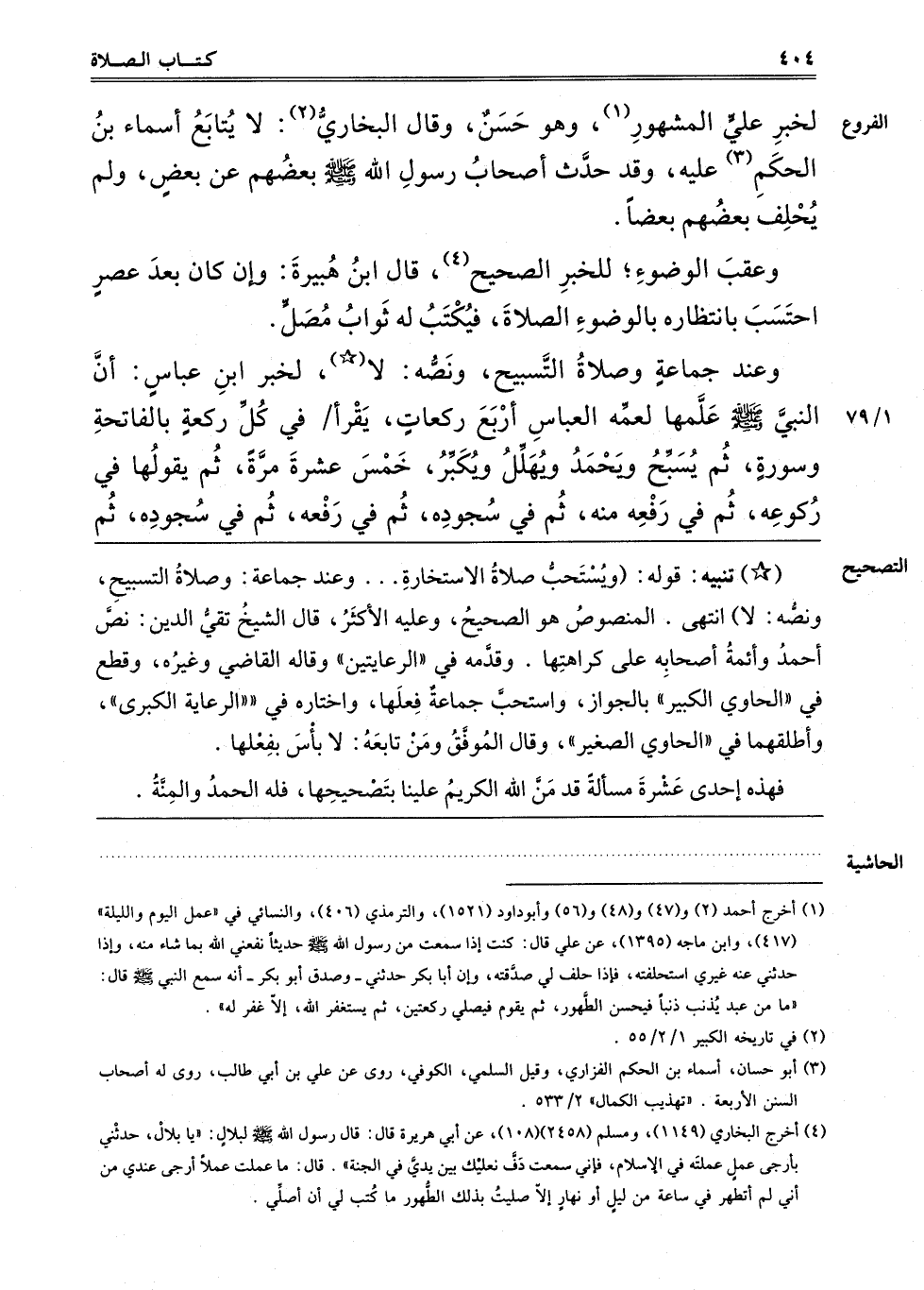 ـــــــــــــــــــــــــــــQتَنْبِيهٌ: قَوْلُهُ وَيُسْتَحَبُّ صَلَاةُ الِاسْتِخَارَةِ، وَعِنْدَ جَمَاعَةٍ وَصَلَاةُ التَّسْبِيحِ، وَنَصُّهُ لَا، انْتَهَى، الْمَنْصُوصُ هُوَ الصَّحِيحُ وَعَلَيْهِ الْأَكْثَرُ، قَالَ الشَّيْخُ تَقِيُّ الدِّينِ نَصَّ أَحْمَدُ وَأَئِمَّةُ أَصْحَابِهِ عَلَى كَرَاهَتِهَا، وَقَدَّمَهُ فِي الرِّعَايَتَيْنِ وَقَالَهُ الْقَاضِي وَغَيْرُهُ، وَقَطَعَ فِي الْحَاوِي الْكَبِيرِ بِالْجَوَازِ، وَاسْتَحَبَّ جَمَاعَةٌ فِعْلَهَا، وَاخْتَارَهُ فِي الرِّعَايَةِ الْكُبْرَى، وَأَطْلَقَهُمَا فِي الْحَاوِي الصَّغِيرِ، وَقَالَ الْمُوَفَّقُ وَمَنْ تَابَعَهُ لَا بَأْسَ بِفِعْلِهَا، فَهَذِهِ إحْدَى عَشْرَةَ مَسْأَلَةً قَدْ مَنَّ اللَّهُ الكريم علينا بتصحيحها، فله الحمد والمنة.
