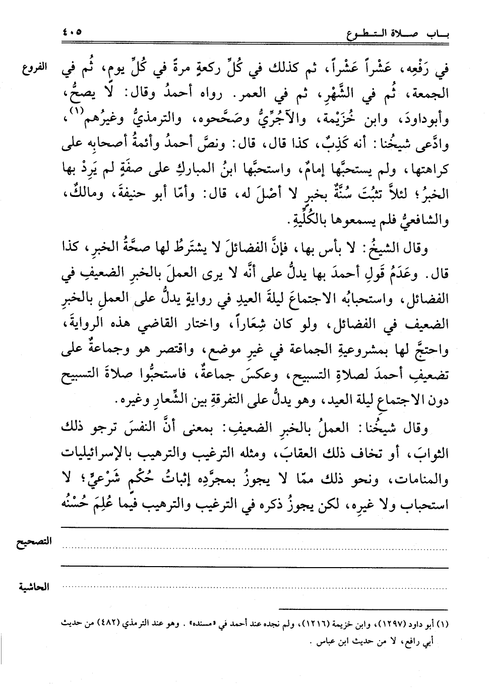 وَقَالَ الشَّيْخُ: لَا بَأْسَ بِهَا، فَإِنَّ الْفَضَائِلَ لَا تُشْتَرَطُ لَهَا صِحَّةُ الْخَبَرِ، كَذَا قَالَ، وَعَدَمُ قَوْلِ أَحْمَدَ بِهَا يَدُلُّ عَلَى أَنَّهُ لَا يَرَى الْعَمَلَ بِالْخَبَرِ الضَّعِيفِ فِي الْفَضَائِلِ، وَاسْتِحْبَابُهُ الِاجْتِمَاعَ لَيْلَةَ الْعِيدِ فِي رِوَايَةٍ يَدُلُّ عَلَى الْعَمَلِ بِالْخَبَرِ الضَّعِيفِ فِي الْفَضَائِلِ، وَلَوْ كَانَ شِعَارًا، وَاخْتَارَ الْقَاضِي هَذِهِ الرِّوَايَةَ، وَاحْتَجَّ لَهَا بِمَشْرُوعِيَّةِ الْجَمَاعَةِ فِي غَيْرِ مَوْضِعٍ، وَاقْتَصَرَ هُوَ وَجَمَاعَةٌ عَلَى تَضْعِيفِ أَحْمَدَ لِصَلَاةِ التَّسْبِيحِ، وَعَكَسَ جَمَاعَةٌ فَاسْتَحَبُّوا صَلَاةَ التَّسْبِيحِ دُونَ الِاجْتِمَاعِ لَيْلَةَ الْعِيدِ، وَهُوَ يَدُلُّ عَلَى التَّفْرِقَةِ بَيْنَ الشِّعَارِ وَغَيْرِهِ.