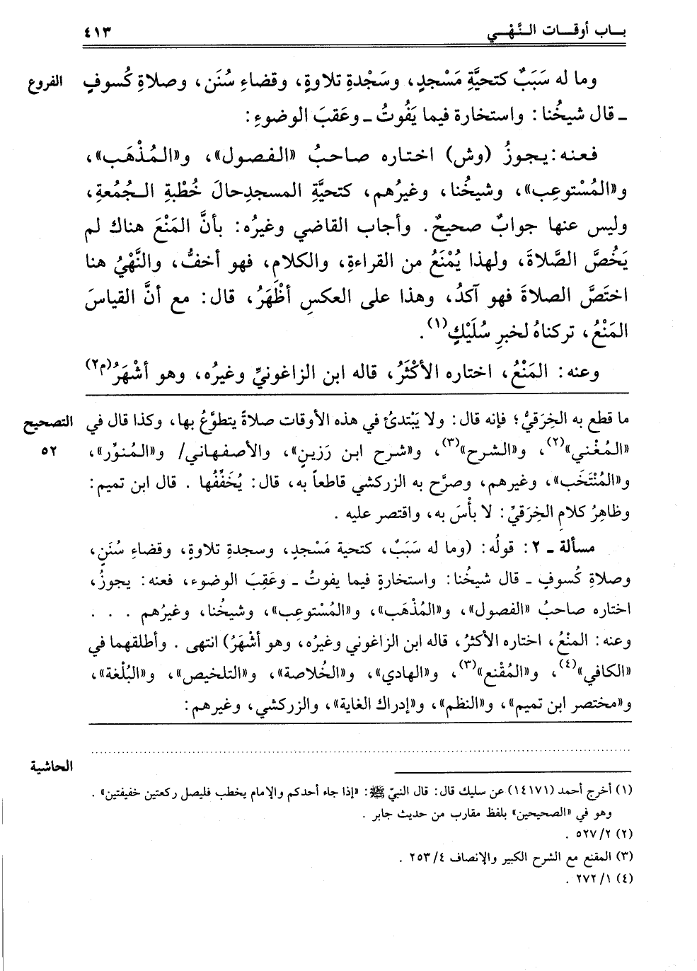 مَسْأَلَةٌ 2: وَمَا لَهُ سَبَبٌ كَتَحِيَّةِ مَسْجِدٍ وَسَجْدَةِ تِلَاوَةٍ وَقَضَاءِ سُنَنٍ وَصَلَاةِ كُسُوفٍ قَالَ شَيْخُنَا وَاسْتِخَارَةٍ فِيمَا يَفُوتُ وَعَقِبَ وُضُوءٍ فَعَنْهُ يَجُوزُ، اخْتَارَهُ صَاحِبُ الْفُصُولِ، وَالْمُذْهَبِ، وَالْمُسْتَوْعِبِ، وَشَيْخُنَا، وَغَيْرُهُمْ، وَعَنْهُ الْمَنْعُ، اخْتَارَهُ الْأَكْثَرُ، قَالَهُ ابْنُ الزَّاغُونِيِّ وَغَيْرُهُ، وَهُوَ أَشْهَرُ، انْتَهَى، وَأَطْلَقَهُمَا فِي الْكَافِي4، وَالْمُقْنِعِ3، وَالْهَادِي، وَالْخُلَاصَةِ، وَالتَّلْخِيصِ، وَالْبُلْغَةِ، وَمُخْتَصَرِ ابْنِ تَمِيمٍ، وَالنَّظْمِ وَإِدْرَاكِ الْغَايَةِ، والزركشي، وغيرهم: