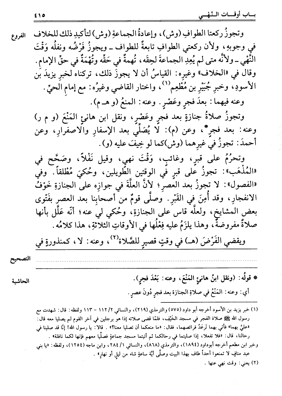 وَتَجُوزُ صَلَاةُ الْجِنَازَةِ بَعْدَ فَجْرٍ وَعَصْرٍ. وَنَقَلَ ابْنُ هَانِئٍ الْمَنْعَ "ور م" وَعَنْهُ بَعْدَ فَجْرٍ، وَعَنْ "م" لَا يُصَلِّي بَعْدَ الْإِسْفَارِ وَالِاصْفِرَارِ، وَعَنْ أَحْمَدَ تَجُوزُ فِي غَيْرِهِمَا "وش" كَمَا لَوْ خيف عليه "و".