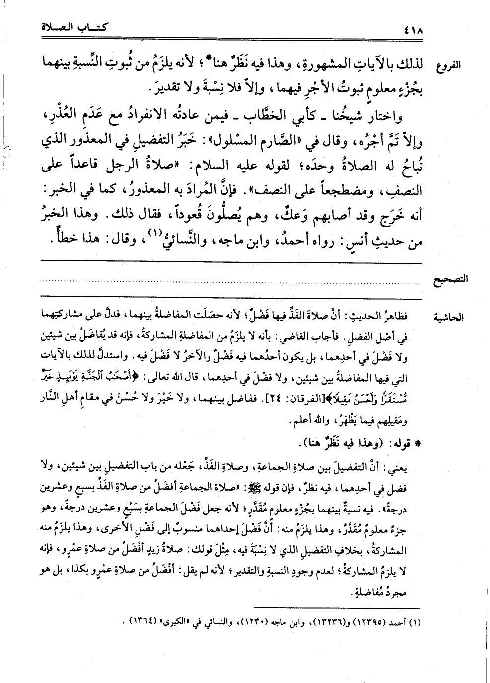 وَاخْتَارَهُ شَيْخُنَا كَأَبِي الْخَطَّابِ فِيمَنْ عَادَتُهُ الِانْفِرَادُ مَعَ عَدَمِ الْعُذْرِ، وَإِلَّا تَمَّ أَجْرُهُ، وَقَالَ فِي "الصَّارِمِ الْمَسْلُولِ" غَيْرِ التَّفْضِيلِ فِي الْمَعْذُورِ الَّذِي تُبَاحُ لَهُ الصَّلَاةُ وَحْدَهُ لِقَوْلِهِ عَلَيْهِ السَّلَامُ: "صَلَاةُ الرَّجُلِ قَاعِدًا عَلَى النِّصْفِ، وَمُضْطَجِعًا عَلَى النِّصْفِ" فَإِنَّ الْمُرَادَ بِهِ الْمَعْذُورُ كَمَا فِي الْخَبَرِ إنَّهُ خَرَجَ وَقَدْ أَصَابَهُمْ وَعْكٌ وَهُمْ يُصَلُّونَ قُعُودًا فَقَالَ ذَلِكَ وَهَذَا الْخَبَرُ مِنْ حَدِيثِ أَنَسٍ رَوَاهُ أَحْمَدُ وابن ماجه والنسائي1 وقال هذا خطأ.