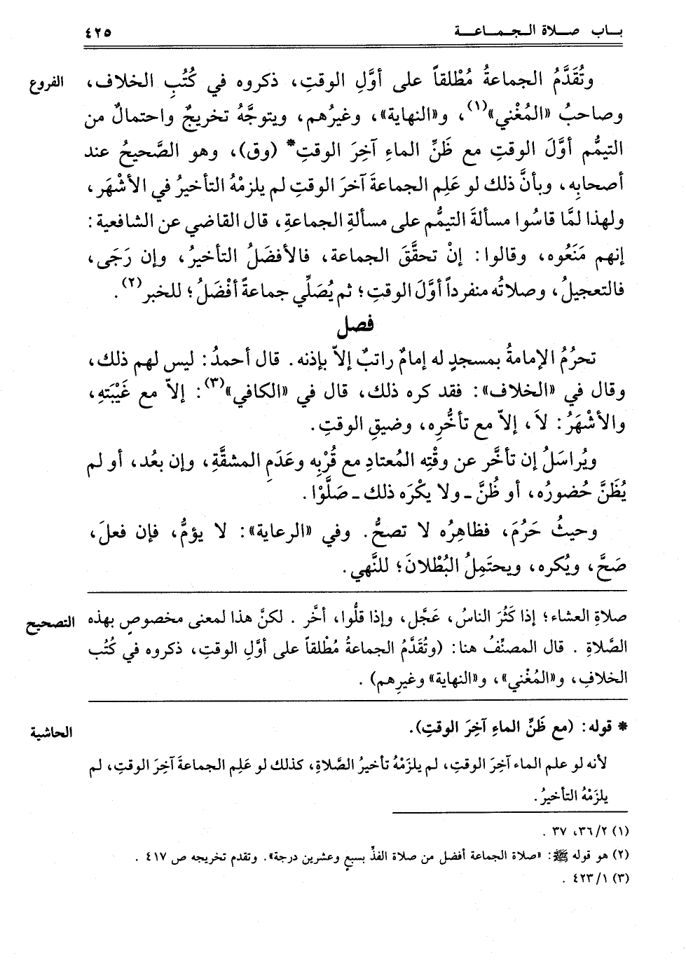 وتقدم الجماعة مطلقا على أول الوقت، ذكروه في كُتُبِ الْخِلَافِ، وَصَاحِبُ الْمُغْنِي1، وَالنِّهَايَةِ، وَغَيْرُهُمْ، وَيَتَوَجَّهُ تَخْرِيجٌ وَاحْتِمَالٌ مِنْ التَّيَمُّمِ أَوَّلَ الْوَقْتِ مَعَ ظن الماء آخر الوقت "وق" وَهُوَ الصَّحِيحُ عِنْدَ أَصْحَابِهِ، وَبِأَنَّ ذَلِكَ لَوْ عَلِمَ الْجَمَاعَةَ آخِرَ الْوَقْتِ لَمْ يَلْزَمْهُ التَّأْخِيرُ فِي الْأَشْهَرِ، وَلِهَذَا لَمَّا قَاسُوا مَسْأَلَةَ التَّيَمُّمِ عَلَى مَسْأَلَةِ الْجَمَاعَةِ قَالَ الْقَاضِي عَنْ الشَّافِعِيَّةِ إنَّهُمْ مَنَعُوهُ، وَقَالُوا إنْ تَحَقَّقَ الْجَمَاعَةَ فَالْأَفْضَلُ التَّأْخِيرُ، وَإِنْ رَجَّى فَالتَّعْجِيلُ وَصَلَاتُهُ مُنْفَرِدًا أَوَّلَ الوقت ثم يصلي جماعة أفضل للخبر2.