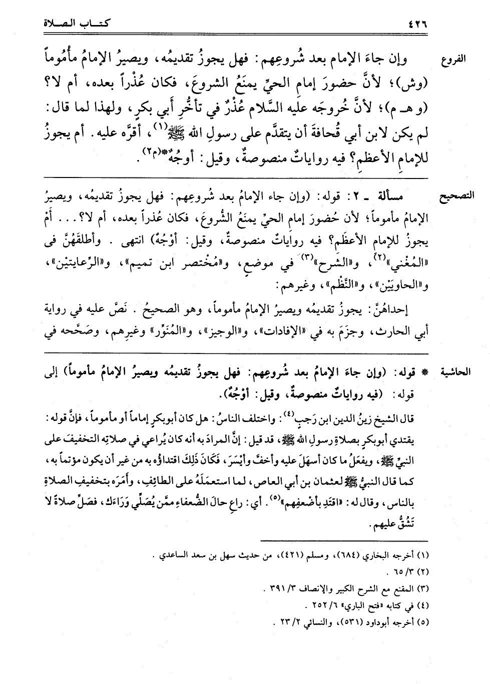 وَإِنْ جَاءَ الْإِمَامُ بَعْد شُرُوعِهِمْ فَهَلْ يَجُوزُ تقديمه ويصير الإمام مأموما "وش" لِأَنَّ حُضُورَ إمَامِ الْحَيِّ يَمْنَعُ الشُّرُوعَ فَكَانَ عذرا بعده أم لا؟ "وهـ م" لِأَنَّ خُرُوجَهُ عَلَيْهِ السَّلَامُ عُذْرٌ فِي تَأَخُّرِ أَبِي بَكْرٍ وَلِهَذَا لَمَّا قَالَ: لَمْ يَكُنْ لِابْنِ أَبِي قُحَافَةَ أَنْ يَتَقَدَّمَ عَلَى رَسُولِ اللَّهِ صَلَّى اللَّهُ عَلَيْهِ وَسَلَّمَ1 أَقَرَّهُ عَلَيْهِ، أَمْ يَجُوزُ لِلْإِمَامِ الْأَعْظَمِ؟ فِيهِ رِوَايَاتٌ منصوصة، وقيل أوجه "م 2".
