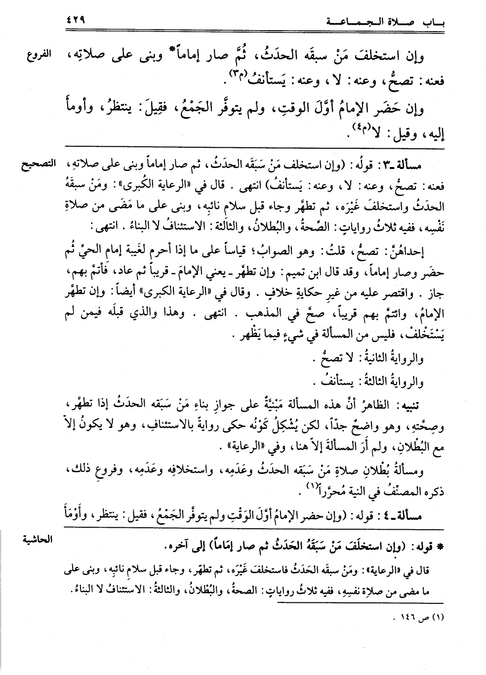 وَمَسْأَلَةُ بُطْلَانِ صَلَاةِ مَنْ سَبَقَهُ الْحَدَثُ وَعَدَمِهِ وَاسْتِخْلَافِهِ وَعَدَمِهِ وَفُرُوعُ ذَلِكَ ذَكَرَهُ الْمُصَنِّفُ فِي النِّيَّةِ مُحَرَّرًا1.