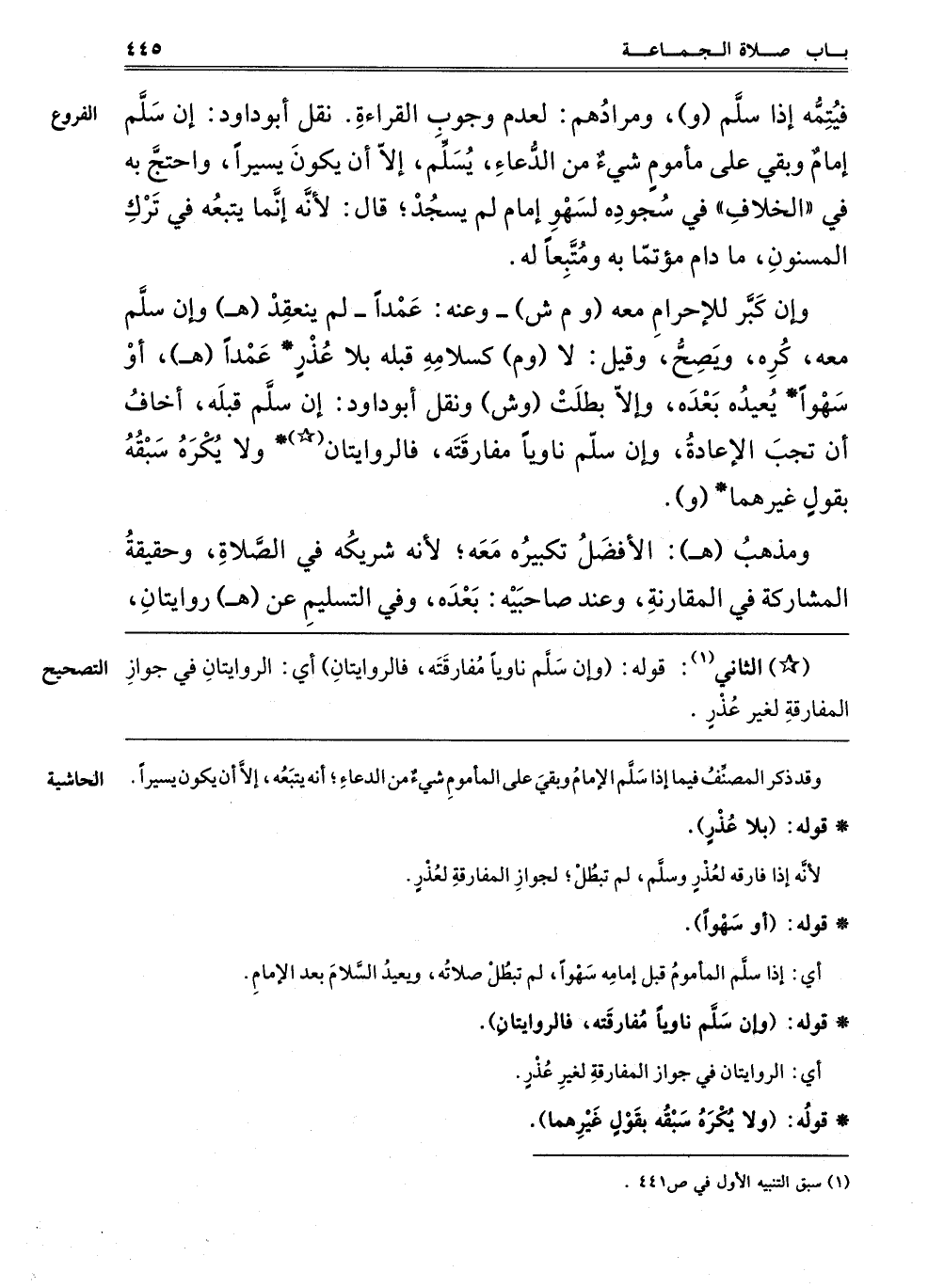 ـــــــــــــــــــــــــــــQالثَّانِي1: قَوْلُهُ: وَإِنْ سَلَّمَ نَاوِيًا مُفَارَقَتَهُ فَالرِّوَايَتَانِ، أَيْ رِوَايَتَانِ فِي جَوَازِ الْمُفَارَقَةِ لِغَيْرِ عُذْرٍ.