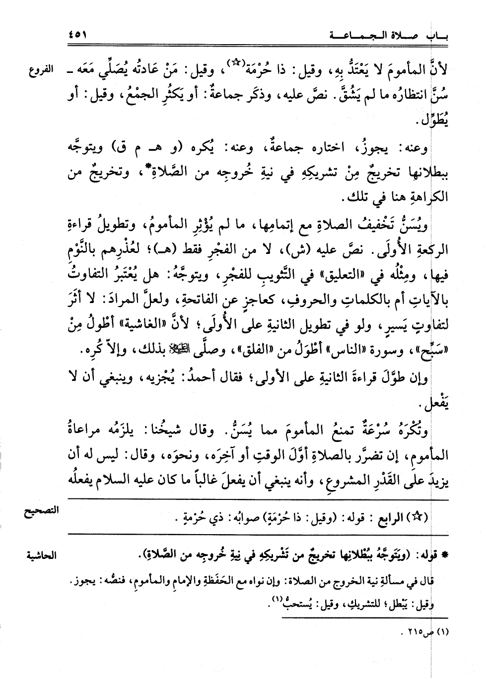 وَعَنْهُ: يَجُوزُ، اخْتَارَهُ جَمَاعَةٌ وعنه يكره "وهـ م قِ" وَيَتَوَجَّهُ بُطْلَانُهَا تَخْرِيجٌ مِنْ تَشْرِيكِهِ فِي نِيَّةِ خُرُوجِهِ مِنْ الصَّلَاةِ، وَتَخْرِيجٌ مِنْ الْكَرَاهَةِ هُنَا فِي تِلْكَ.