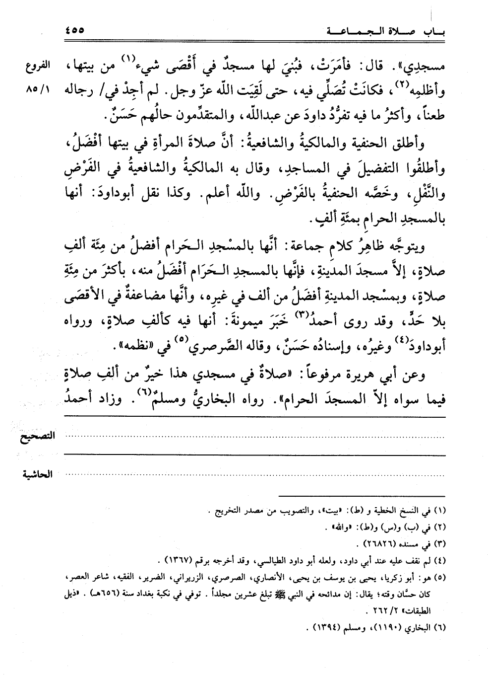 وَيَتَوَجَّهُ ظَاهِرُ كَلَامِ جَمَاعَةٍ أَنَّهَا بِالْمَسْجِدِ الْحَرَامِ أَفْضَلُ مِنْ مِائَةِ أَلْفٍ، إلَّا مَسْجِدَ الْمَدِينَةِ، فَإِنَّهَا بِالْمَسْجِدِ الْحَرَامِ أَفْضَلُ مِنْهُ، بِأَكْثَرَ مِنْ مِائَةِ صَلَاةٍ وَبِمَسْجِدِ الْمَدِينَةِ أَفْضَلُ مِنْ أَلْفٍ فِي غَيْرِهِ، وَأَنَّهَا مُضَاعَفَةٌ فِي الْأَقْصَى بِلَا حَدٍّ، وَقَدْ رَوَى أَحْمَدُ3 خَبَرَ مَيْمُونَةَ أَنَّهَا فِيهِ كَأَلْفِ صَلَاةٍ، وَرَوَاهُ أَبُو دَاوُد4 وَغَيْرُهُ، وَإِسْنَادُهُ حَسَنٌ. وَقَالَهُ الصَّرْصَرِيُّ5 فِي نَظْمِهِ.
