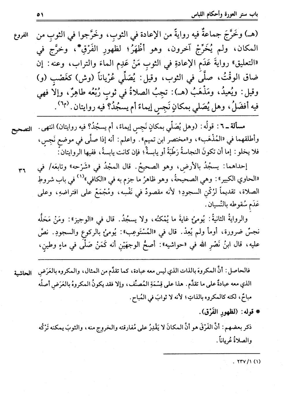 "هـ" وَخَرَّجَ جَمَاعَةٌ فِيهِ رَاوِيَةً مِنْ الْإِعَادَةِ فِي الثَّوْبِ وَخَرَّجُوا فِي الثَّوْبِ مِنْ الْمَكَانِ، وَلَمْ يُخَرِّجْ آخَرُونَ، وَهُوَ أَظْهَرُ لِظُهُورِ الْفَرْقِ، وَخَرَّجَ فِي التَّعْلِيقِ رِوَايَةَ عَدَمِ الْإِعَادَةِ فِي الثَّوْبِ مِنْ عَدَمِ الْمَاءِ وَالتُّرَابِ، وَعَنْهُ إنْ ضَاقَ الْوَقْتُ صَلَّى فِي الثَّوْبِ، وَقِيلَ: يُصَلِّي عريانا "وش" كَغَصْبٍ "و" وَقِيلَ: وَيُعِيدُ وَمَذْهَبٌ "هـ": تَجِبُ الصَّلَاةُ فِي ثَوْبٍ رُبْعُهُ طَاهِرٌ، وَإِلَّا فَهِيَ فِيهِ أَفْضَلُ. وَهَلْ يُصَلِّي بِمَكَانٍ نَجِسٍ إيمَاءً أَمْ يَسْجُدُ؟ فِيهِ رِوَايَتَانِ "م 6".