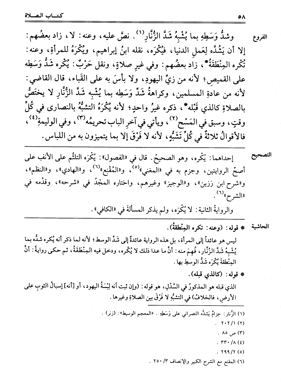 وشد وسطه بما يشبه الزُّنَّارَ1. نَصَّ عَلَيْهِ وَعَنْهُ لَا، زَادَ بَعْضُهُمْ: إلَّا أَنْ يَشُدَّهُ لِعَمَلِ الدُّنْيَا فَيُكْرَهُ، نَقَلَهُ ابْنُ إبْرَاهِيمُ، وَيُكْرَهُ لِلْمَرْأَةِ، وَعَنْهُ يُكْرَهُ الْمِنْطَقَةُ، زَادَ بَعْضُهُمْ وَفِي غَيْرِ صَلَاةٍ، وَنَقَلَ حَرْبٌ يُكْرَهُ شَدُّ وَسَطِهِ عَلَى الْقَمِيصِ، لِأَنَّهُ مِنْ زِيِّ الْيَهُودِ، وَلَا بَأْسَ بِهِ عَلَى الْقَبَاءِ، قَالَ الْقَاضِي: لِأَنَّهُ مِنْ عَادَةِ الْمُسْلِمِينَ، وَكَرَاهَةُ شَدِّ وَسَطِهِ بِمَا يُشْبِهُ الزُّنَّارَ لَا يَخْتَصُّ بِالصَّلَاةِ كَاَلَّذِي قَبْلَهُ، ذَكَرَهُ غَيْرُ وَاحِدٍ، لِأَنَّهُ يُكْرَهُ التَّشَبُّهُ بِالنَّصَارَى فِي كُلِّ وَقْتٍ، وَسَبَقَ فِي الْمَسْحِ2، وَيَأْتِي فِي آخَرِ الْبَابِ تَحْرِيمُهُ3، وَفِي الْوَلِيمَةِ4 فِي الْأَقْوَالِ ثَلَاثَةٌ فِي كُلٍّ تُشْبِهُ، لِأَنَّهُ لَا فَرْقَ إلَّا بِمَا يَتَمَيَّزُونَ به من اللباس