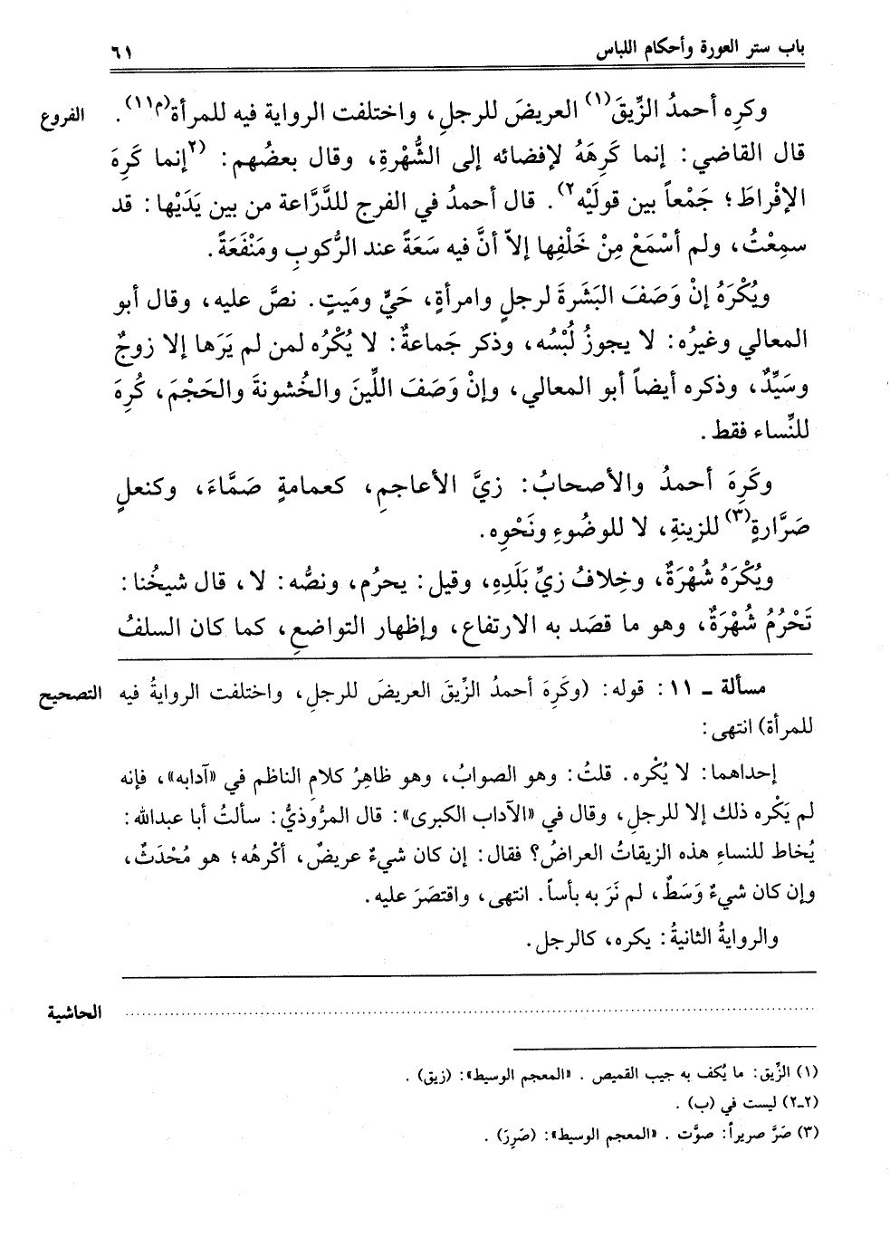 ـــــــــــــــــــــــــــــQمَسْأَلَةٌ 11: قَوْلُهُ: وَكَرِهَ أَحْمَدُ الزِّيقَ الْعَرِيضَ لِلرَّجُلِ، وَاخْتَلَفَتْ الرِّوَايَةُ فِيهِ لِلْمَرْأَةِ، انْتَهَى.