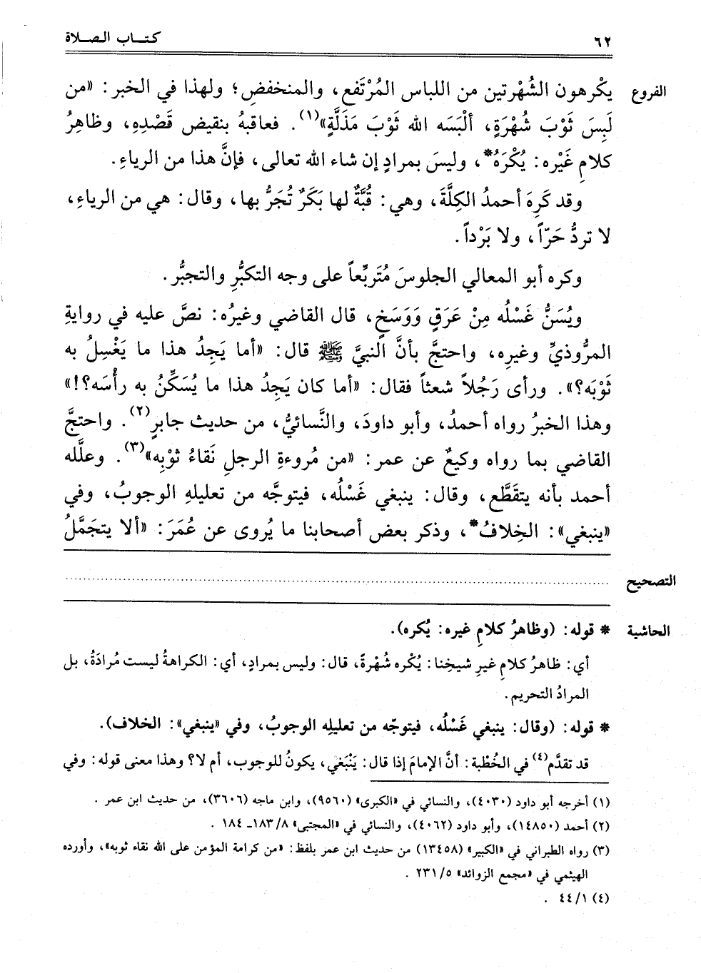 وَيُسَنُّ غَسْلُهُ مِنْ عَرَقٍ وَوَسَخٍ، قَالَ الْقَاضِي وَغَيْرُهُ: نَصَّ عَلَيْهِ فِي رِوَايَةِ الْمَرُّوذِيُّ وَغَيْرِهِ، وَاحْتَجَّ بِأَنَّ النَّبِيَّ صَلَّى اللَّهُ عَلَيْهِ وَسَلَّمَ قَالَ: "أَمَا يَجِدُ هَذَا مَا يَغْسِلُ بِهِ ثَوْبَهُ" وَرَأَى رَجُلًا شَعِثًا فَقَالَ: "أَمَا كَانَ يَجِدُ هَذَا مَا يُسَكِّنُ بِهِ رَأْسَهُ". وهذا الخبر رواه أحمد وَأَبُو دَاوُد وَالنَّسَائِيُّ مِنْ حَدِيثِ جَابِرٍ2، وَاحْتَجَّ الْقَاضِي بِمَا رَوَاهُ وَكِيعٌ عَنْ عُمَرَ "مِنْ مُرُوءَةِ الرَّجُلِ نَقَاءُ ثَوْبِهِ" 3. وَعَلَّلَهُ أَحْمَدُ بِأَنَّهُ مُنْقَطِعٌ. وَقَالَ: يَنْبَغِي غَسْلُهُ، فَيُتَوَجَّهُ مِنْ تَعْلِيلِهِ الْوُجُوبُ، وَفِي "يَنْبَغِي" الْخِلَافُ، وَذَكَرَ بَعْضُ أَصْحَابِنَا ما يروى عن عمر: "ألا يتجمل