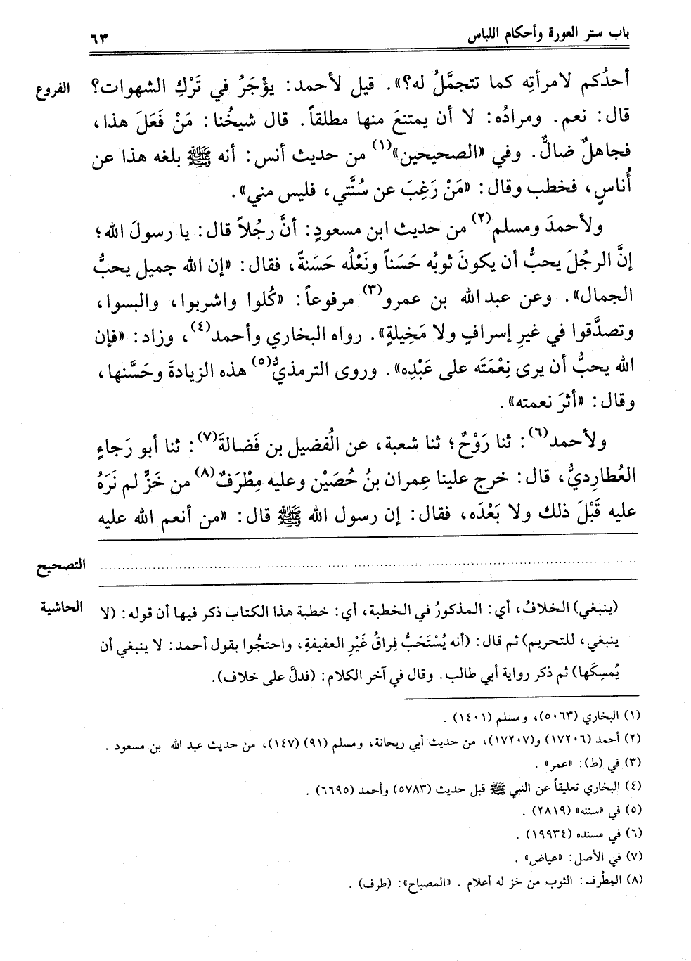 وَلِأَحْمَدَ وَمُسْلِمٍ2 مِنْ حَدِيثِ ابْنِ مَسْعُودٍ: أَنَّ رَجُلًا قَالَ: يَا رَسُولَ اللَّهِ؛ إنَّ الرَّجُلَ يُحِبُّ أَنْ يَكُونَ ثَوْبُهُ حَسَنًا وَنَعْلُهُ حَسَنًا، فَقَالَ: "إنَّ اللَّهَ جَمِيلٌ يُحِبُّ الجمال". وعن عبد الله بن عمرو3 مَرْفُوعًا: "كُلُوا، وَاشْرَبُوا، وَالْبَسُوا، وَتَصَدَّقُوا فِي غَيْرِ إسْرَافٍ وَلَا مَخِيلَةٍ" رَوَاهُ الْبُخَارِيُّ وَأَحْمَدُ4 وَزَادَ: "فَإِنَّ اللَّهَ يُحِبُّ أَنْ يَرَى أَثَرَ نِعْمَتِهِ عَلَى عَبْدِهِ". وَرَوَى التِّرْمِذِيُّ5 هَذِهِ الزِّيَادَةَ وَحَسَّنَهَا وَقَالَ: "أَثَرَ نِعْمَتِهِ".