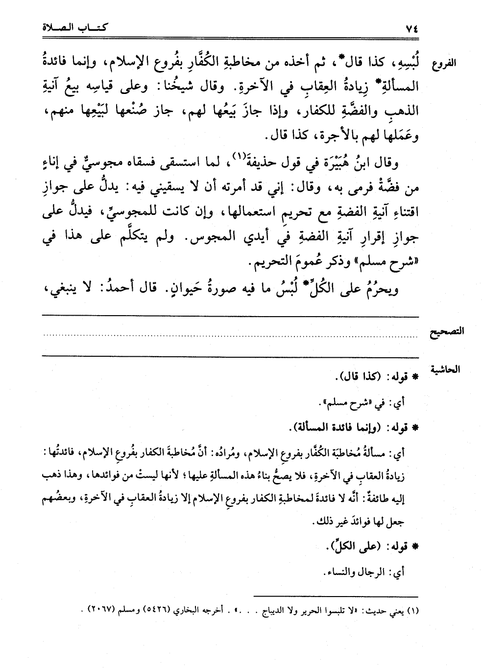 لُبْسِهِ كَذَا قَالَ، ثُمَّ أَخَذَهُ مِنْ مُخَاطَبَةِ الْكُفَّارِ بِفُرُوعِ الْإِسْلَامِ، وَإِنَّمَا فَائِدَةُ الْمَسْأَلَةِ زِيَادَةُ الْعِقَابِ فِي الْآخِرَةِ. قَالَ شَيْخُنَا: وَعَلَى قِيَاسِهِ بَيْعُ آنِيَةِ الذَّهَبِ، وَالْفِضَّةِ لِلْكُفَّارِ، وَإِذَا جَازَ بَيْعُهَا لَهُمْ جَازَ صَبْغُهَا لِبَيْعِهَا مِنْهُمْ، وَعَمَلُهَا لَهُمْ بِالْأُجْرَةِ، كَذَا قَالَ.