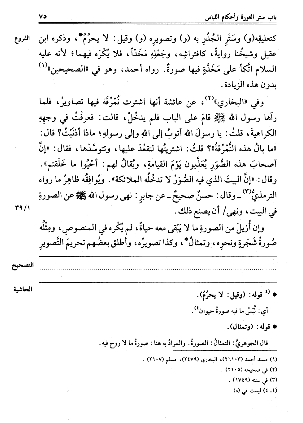 كَتَعْلِيقِهِ "و" وَسِتْرِ الْجُدُرِ بِهِ "و" وَتَصْوِيرِهِ "و" وَقِيلَ: لَا يَحْرُمُ، وَذَكَرَهُ ابْنُ عَقِيلٍ وَشَيْخُنَا رِوَايَةً، كَافْتِرَاشِهِ، وَجَعْلِهِ مِخَدًّا فَلَا يُكْرَهُ فِيهِمَا، لِأَنَّهُ عَلَيْهِ السَّلَامُ اتَّكَأَ عَلَى مِخَدَّةٍ فِيهَا صُورَةٌ رَوَاهُ أَحْمَدُ، وَهُوَ فِي الصَّحِيحَيْنِ1 بِدُونِ هَذِهِ الزِّيَادَةِ.