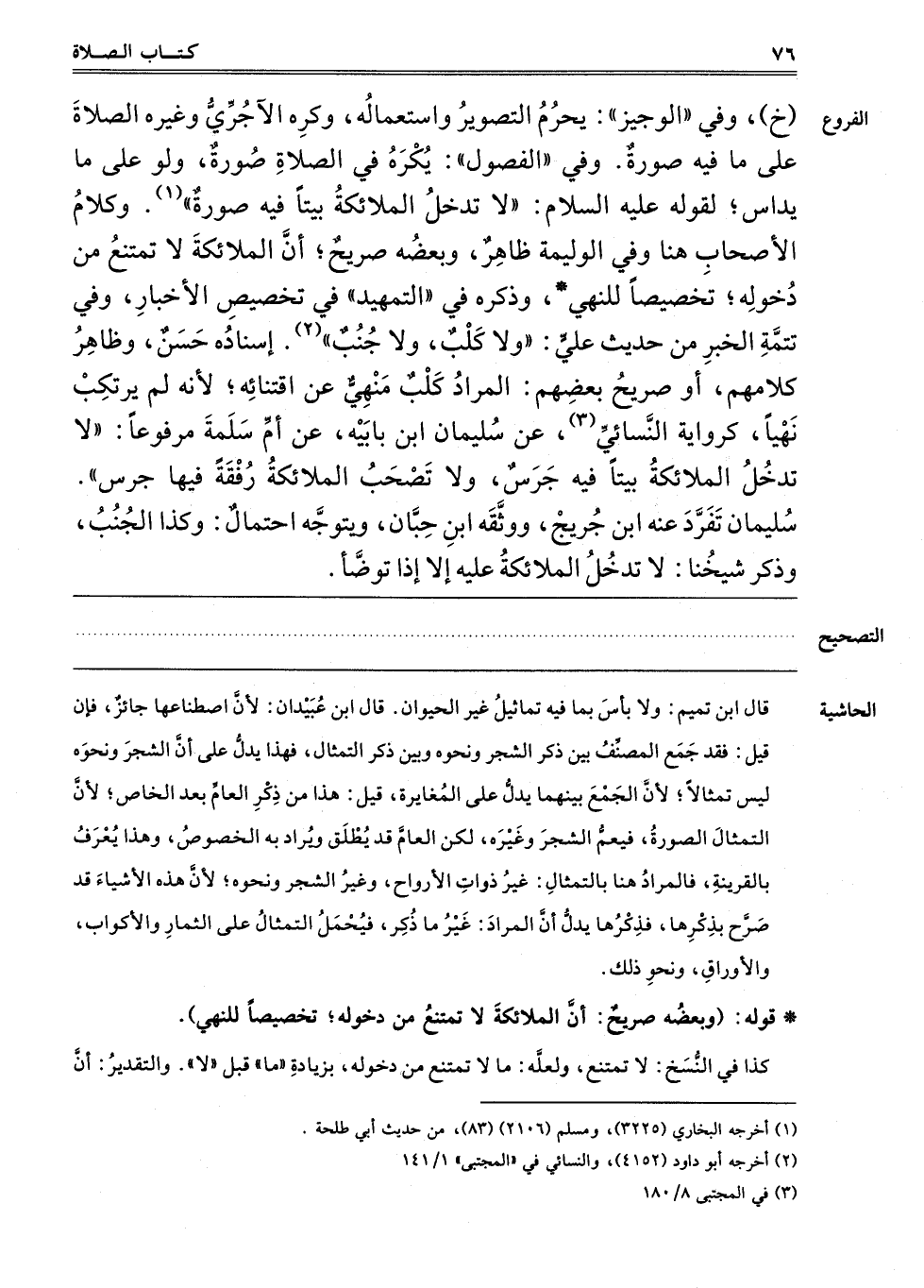 "خ" وفي الوجيز يحرم التصوير وَاسْتِعْمَالُهُ، وَكَرِهَ الْآجُرِّيُّ وَغَيْرُهُ الصَّلَاةَ عَلَى مَا فِيهِ صُورَةٌ. وَفِي الْفُصُولِ: يُكْرَهُ فِي الصَّلَاةِ صُورَةٌ، وَلَوْ عَلَى مَا يُدَاسُ، لِقَوْلِهِ عَلَيْهِ السَّلَامُ: "لَا تَدْخُلُ الْمَلَائِكَةُ بَيْتًا فِيهِ صُورَةٌ" 1. وَكَلَامُ الْأَصْحَابِ هُنَا ظَاهِرٌ، وَبَعْضُهُ صَرِيحٌ أَنَّ الْمَلَائِكَةَ لَا تُمْنَعُ مِنْ دُخُولِهِ، تَخْصِيصًا لِلنَّهْيِ، وَذَكَرَهُ فِي التَّمْهِيدِ فِي تَخْصِيصِ الْأَخْبَارِ. وَفِي تَتِمَّةِ الْخَبَرِ مِنْ حَدِيثِ عَلِيٍّ "وَلَا كَلْبٌ، وَلَا جُنُبٌ"2. إسْنَادُهُ حَسَنٌ، وَظَاهِرُ كَلَامِهِمْ أَوْ صَرِيحُ بَعْضِهِمْ الْمُرَادُ كَلْبٌ مَنْهِيٌّ عَنْ اقْتِنَائِهِ، لِأَنَّهُ لَمْ يَرْتَكِبْ نَهْيًا، كَرِوَايَةِ النَّسَائِيّ3 عَنْ سُلَيْمَان بْنِ بَابَيْهِ عَنْ أُمِّ سَلَمَةَ مَرْفُوعًا"لَا تَدْخُلُ الْمَلَائِكَةُ بَيْتًا فِيهِ جَرَسٌ، وَلَا تَصْحَبُ الْمَلَائِكَةُ رُفْقَةً فِيهَا جَرَسٌ" سُلَيْمَانَ تَفَرَّدَ عنه ابْنِ جُرَيْجٍ، وَوَثَّقَهُ ابْنُ حِبَّانَ، وَيُتَوَجَّهُ احْتِمَالُ، وَكَذَا الْجُنُبُ، وَذَكَرَ شَيْخُنَا لَا تَدْخُلُ الْمَلَائِكَةُ عليه إلا إذا توضأ.