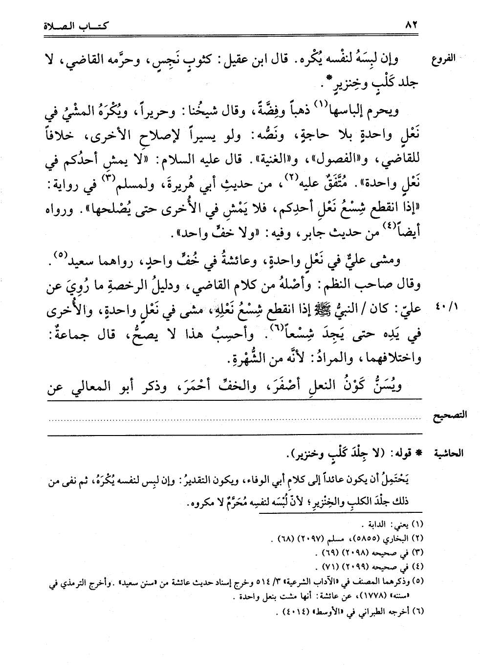 وَقَالَ صَاحِبُ النَّظْمِ: وَلَعَلَّهُ مِنْ كَلَامِ الْقَاضِي، وَدَلِيلُ الرُّخْصَةِ مَا رُوِيَ عَنْ عَلِيٍّ كَانَ النَّبِيُّ صَلَّى اللَّهُ عَلَيْهِ وَسَلَّمَ إذَا انْقَطَعَ شِسْعُ نَعْلِهِ مَشَى فِي نَعْلٍ وَاحِدَةٍ، وَالْأُخْرَى فِي يَدِهِ حَتَّى يَجِدَ شِسْعًا6. وَأَحْسَبُ هَذَا لَا يَصِحُّ، قَالَ جَمَاعَةٌ: وَالْمُرَادُ لِأَنَّهُ مِنْ الشُّهْرَةِ.