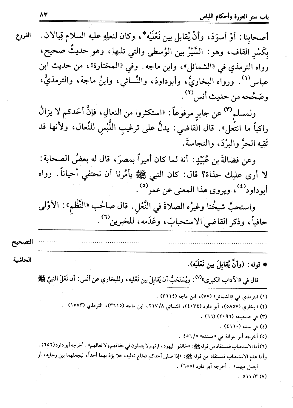 أَصْحَابِنَا: أَوْ أَسْوَدَ، وَأَنْ يُقَابِلَ بَيْنَ نَعْلَيْهِ،. وَكَانَ لِنَعْلَيْهِ عَلَيْهِ السَّلَامُ قِبَالَانِ بِكَسْرِ الْقَافِ، وَهُوَ السَّيْرُ بَيْنَ الْوُسْطَى وَاَلَّتِي تَلِيهَا، وَهُوَ حَدِيثٌ صَحِيحٌ، رَوَاهُ التِّرْمِذِيُّ فِي الشَّمَائِلِ، وَابْنُ مَاجَهْ، وَفِي الْمُخْتَارِ مِنْ حَدِيثِ ابْنِ عَبَّاسٍ1.وَرَوَاهُ الْبُخَارِيُّ، وَأَبُو دَاوُد، وَالنَّسَائِيُّ وَابْنُ مَاجَهْ وَالتِّرْمِذِيُّ، وَصَحَّحَهُ مِنْ حَدِيثِ أَنَسٍ2.