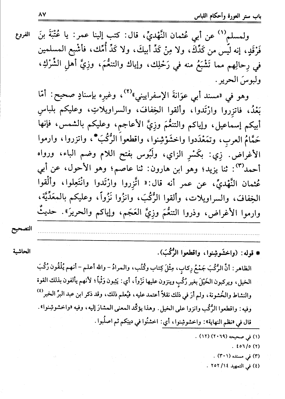 وَهُوَ فِي مُسْنَدِ أَبِي عَوَانَةَ الْإسْفَرايِينِيّ2، وَغَيْرِهِ بِإِسْنَادٍ صَحِيحٍ، "أَمَّا بَعْدُ فَاتَّزِرُوا وَارْتَدَوْا، وَأَلْقَوْا الْخِفَافَ، وَالسَّرَاوِيلَاتِ، وَعَلَيْكُمْ بِلِبَاسِ أَبِيكُمْ إسْمَاعِيلَ، وَإِيَّاكُمْ وَالتَّنَعُّمَ وَزِيَّ الْأَعَاجِمِ، وَعَلَيْكُمْ بِالشَّمْسِ، فَإِنَّهَا حَمَّامُ الْعَرَبِ، وَتَمَعْدَدُوا وَاخْشَوْشِنُوا، وَاقْطَعُوا الرَّكْبَ، وَاتَّزِرُوا، وَارْمُوا الْأَعْرَاضَ" [زِيٌّ بِكَسْرِ الزَّايِ وَلَبُوسُ بِفَتْحِ اللَّامِ وَضَمِّ الْبَاءِ] وَرَوَاهُ أَحْمَدُ3: حَدَّثَنَا يَزِيدُ وَهُوَ ابْنُ هَارُونَ، ثَنَا عَاصِمٌ وَهُوَ الْأَحْوَلُ عَنْ أَبِي عُثْمَانَ النَّهْدِيِّ، عَنْ عُمَرَ أَنَّهُ قَالَ: اتَّزَرُوا وَارْتَدُّوا وَانْتَعِلُوا، وَأَلْقَوْا الْخِفَافَ، وَالسَّرَاوِيلَاتِ. وَأَلْقَوْا الرَّكْبَ، وَانْزُوا نَزْوًا وَعَلَيْكُمْ بِالْمَعِدِيَّةِ وَارْمُوا الْأَعْرَاضَ، وَذَرُوا التنعم وزي العجم، وإياكم والحرير "حديث