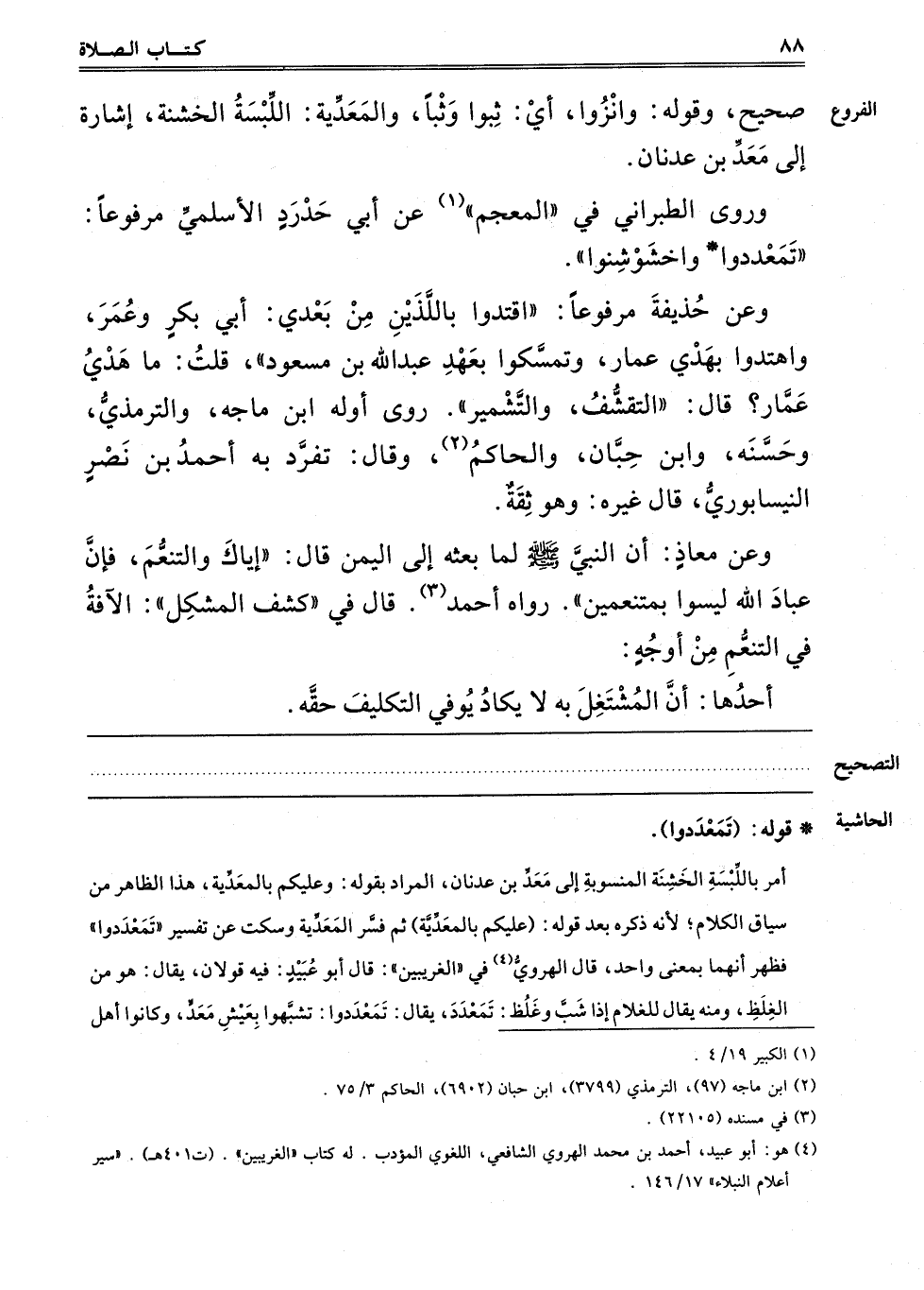 وَرَوَى الطَّبَرَانِيُّ فِي الْمُعْجَمِ1 عَنْ أَبِي حَدْرَدَ الْأَسْلَمِيِّ مَرْفُوعًا"تَمَعْدَدُوا وَاخْشَوْشِنُوا" وَعَنْ حُذَيْفَةَ مَرْفُوعًا "اقْتَدُوا بِاَللَّذَيْنِ مِنْ بَعْدِي: أَبِي بَكْرٍ وَعُمَرَ، اهْتَدُوا بِهَدْيِ عَمَّارٍ، وَتَمَسَّكُوا بِعَهْدِ عَبْدِ اللَّهِ بْنِ مَسْعُودٍ". قُلْت: مَا هَدْيُ عَمَّارٍ؟ قَالَ:"الْقُشْفُ، وَالتَّشْمِيرُ" رَوَى أَوَّلَهُ ابْنُ مَاجَهْ، وَالتِّرْمِذِيُّ، وَحَسَّنَهُ، وَابْنُ حِبَّانَ وَالْحَاكِمُ2. وَقَالَ تَفَرَّدَ بِهِ أَحْمَدُ بْنُ نَصْرٍ النَّيْسَابُورِيُّ، قَالَ غَيْرُهُ: وَهُوَ ثِقَةٌ.