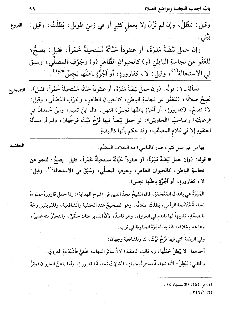 ـــــــــــــــــــــــــــــQمَسْأَلَةٌ 1: قَوْلُهُ: وَإِنْ حَمَلَ بَيْضَةً مَذِرَةً، أَوْ عُنْقُودًا حَبَّاتُهُ مُسْتَحِيلَةٌ خَمْرًا، فَقِيلَ تَصِحُّ صَلَاتُهُ، لِلْعَفْوِ عَنْ نَجَاسَةِ الْبَاطِنِ، كَالْحَيَوَانِ الطَّاهِرِ، وَجَوْفِ الْمُصَلِّي، وَقِيلَ لَا تَصِحُّ، كَقَارُورَةٍ، أَوْ آجُرَّةٍ بَاطِنُهَا نَجِسٌ انْتَهَى. قَالَ ابْنُ تَمِيمٍ وَابْنُ حَمْدَانَ فِي رِعَايَتَيْهِ وَصَاحِبُ الْحَاوِيَيْنِ لَوْ حَمَلَ بَيْضَةً فِيهَا فَرْخٌ مَيِّتٌ وَجْهَانِ، وَلَمْ أَرَ مَسْأَلَةَ الْعُنْقُودِ إلَّا فِي كَلَامِ الْمُصَنِّفِ، وَقَدْ حكم بأنها كالبيضة.