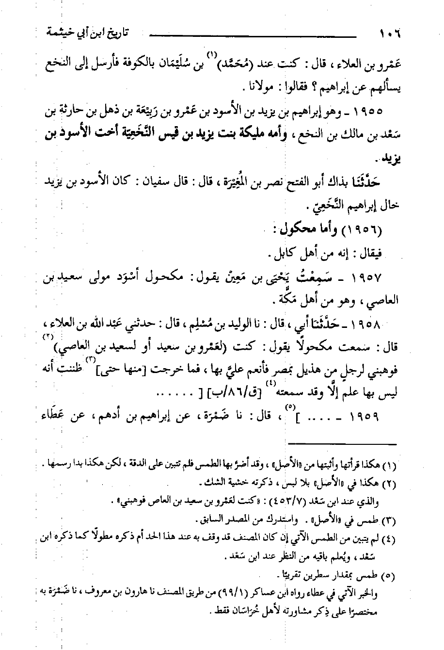 ١٩٥٨- حَدَّثَنا أبي، قَالَ: حَدَّثَنَا الْوَلِيد بْن مُسْلِم، قَالَ: حَدَّثَنِي عَبْد اللَّهِ بْن العلاء، قَالَ: سمعت مكحولا يقول: كنت لعَمْرو بن سعيد أو لسعيد بن العاصي فوهبني لرجلٍ من هذيل بمصر فأنعم عليَّ بها، فما خرجت منها حتى ظننت أنه ليس بها علم إلَاّ وقد سمعته [ق/٨٦/ب] ...