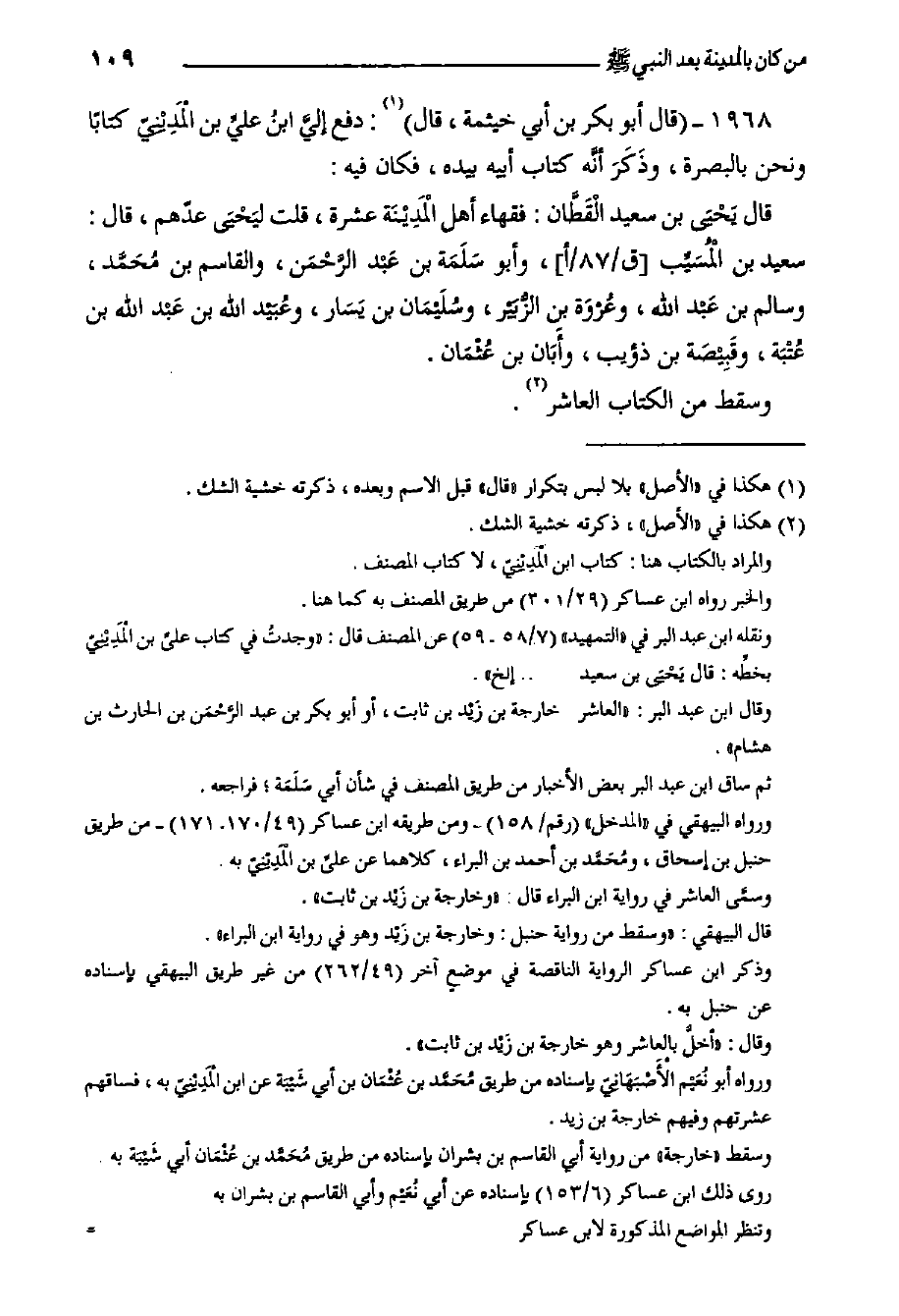 ١٩٦٨- قَالَ أبو بكر بن أبي خيثمة، قَالَ: دفع إليَّ ابنُ عليِّ بن الْمَدِيْنِيّ كتابًا ونحن بالبصرة، وذَكَرَ أنَّه كتاب أبيه بيده، فكان فيه: