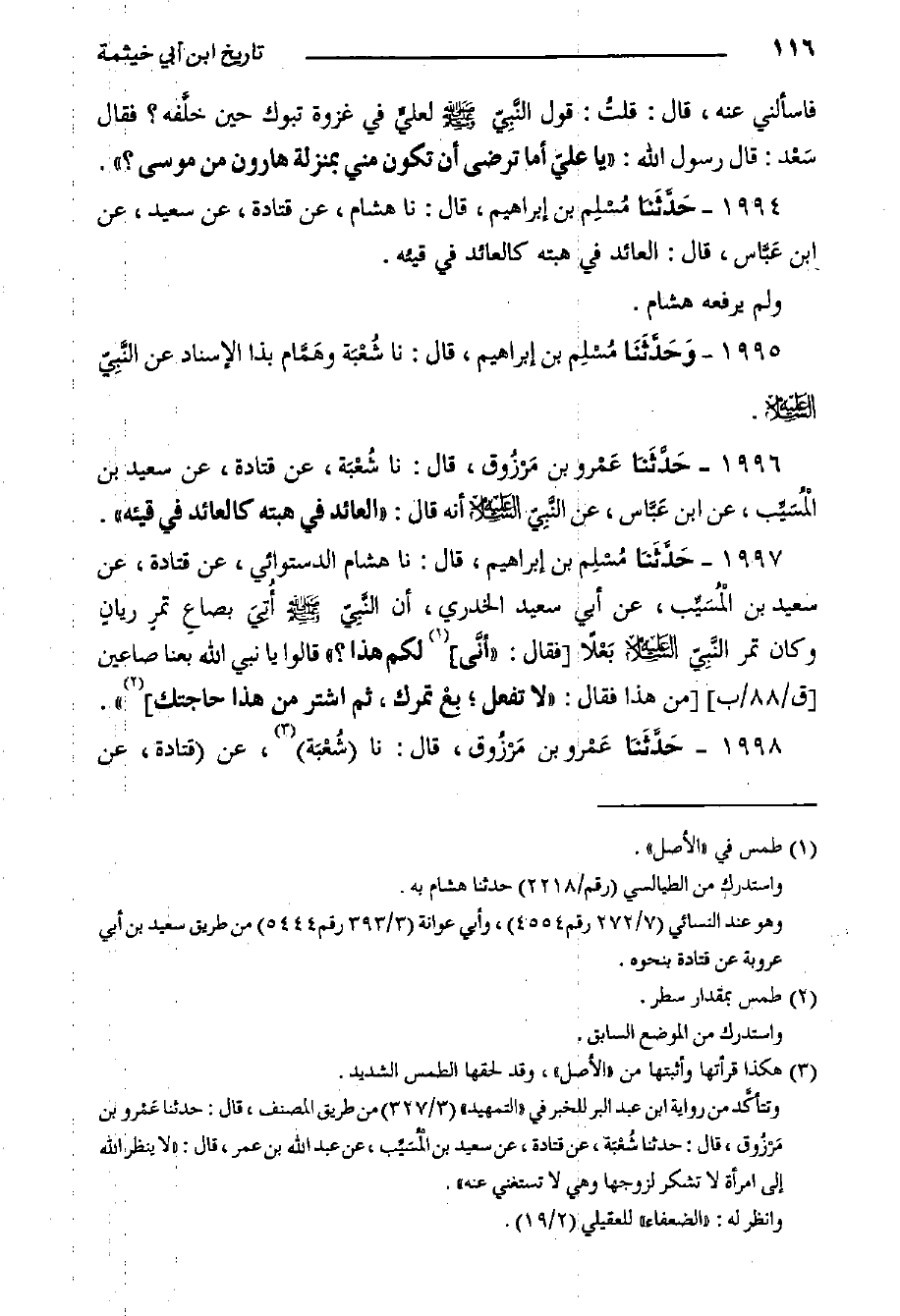 ١٩٩٤- حَدَّثَنا مُسْلِم بْنُ إِبْرَاهِيمَ، قال: حدثنا هِشَامٌ، عَنْ قَتَادَةَ، عَنْ سَعِيدِ، عَنِ ابْنِ عَبَّاس، قَالَ: الْعَائِدُ فِي هِبَتِهِ كَالْعَائِدِ فِي قَيْئِهِ.