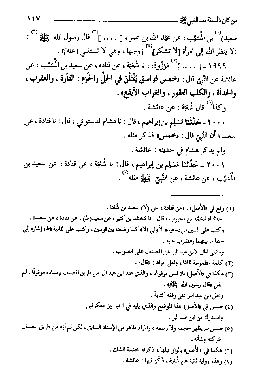 ١٩٩٩- ... مَرْزُوق، حدثنا شُعْبَة، عَنْ قَتَادَةَ، عَنْ سَعِيدِ بْنِ الْمُسَيَّب، عَنْ عَائِشَةَ عَن النَّبِيّ قَالَ: خَمْسُ فَوَاسِقَ يُقْتَلْنَ فِي الحِلِّ والحَرَم: الْفَأْرَةُ، وَالْعَقْرَبُ، وَالْحِدَأَةُ، وَالْكَلْبُ الْعَقُورُ، وَالْغُرَابُ الأَبْقَعُ.