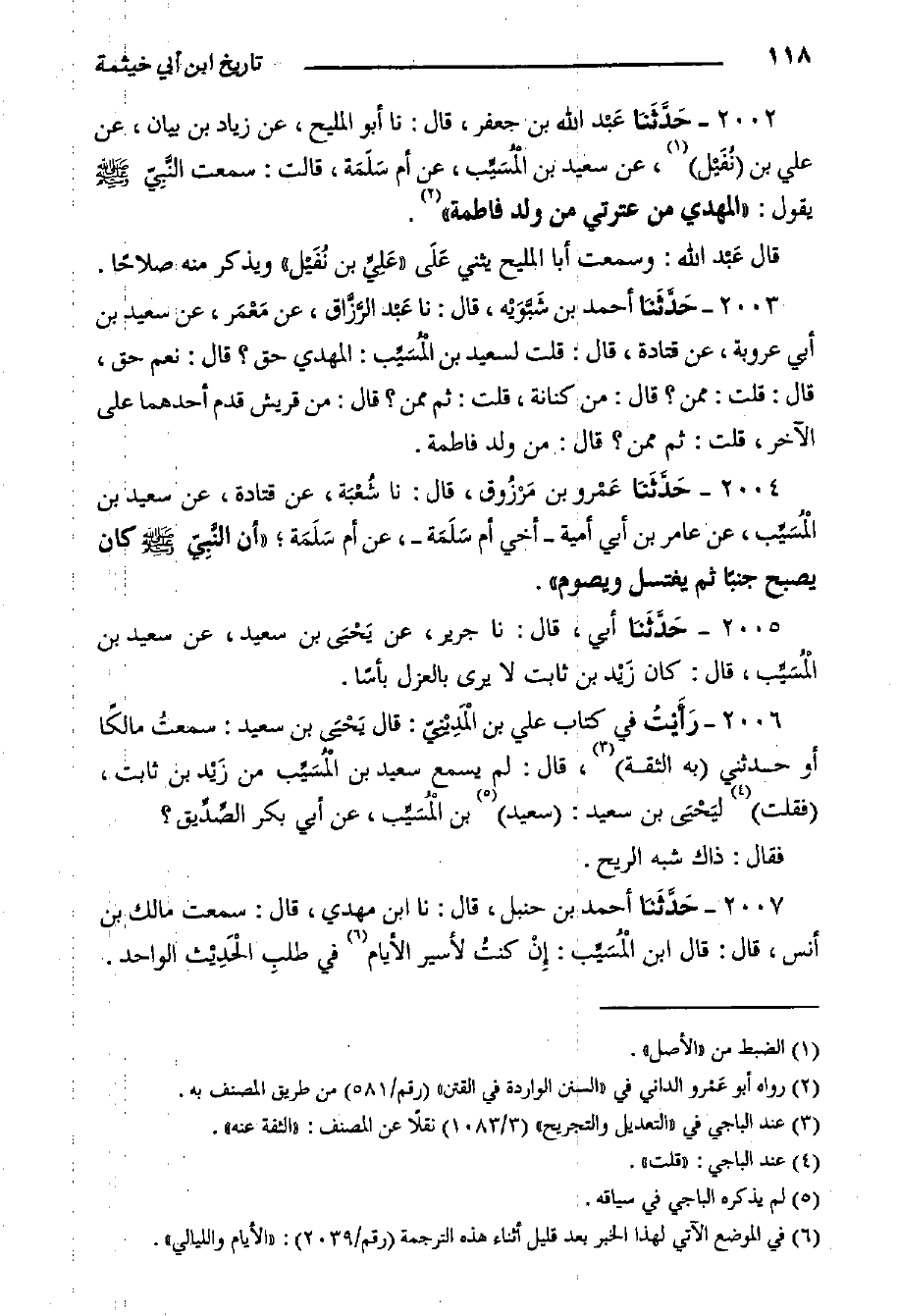 ٢٠٠٢- حَدَّثَنا عَبْد اللَّهِ بْنُ جَعْفَرٍ، قال: حَدَّثَنَا أَبُو الْمَلِيحِ، عَنْ زِيَادِ بْنِ بَيَانٍ، عَنْ عَلِيِّ بْنِ نُفَيْل، عَنْ سَعِيدِ بْنِ الْمُسَيَّب، عَنْ أُمِّ سَلَمَة، قَالَتْ: سَمِعْتُ النَّبِيّ صَلَّى اللَّهُ عَلَيْهِ وَسَلَّمَ يَقُولُ: "الْمَهْدِيُّ مِنْ عِتْرَتِي مِنْ وَلَدِ فَاطِمَةَ".