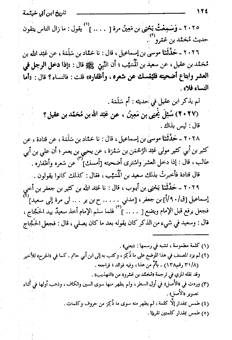 ٢٠٢٦- حَدَّثَنا موسى بن إسماعيل، قال: حدثنا حَمَّاد بْنُ سَلَمَة، عَنْ عَبْد اللَّهِ بْنِ مُحَمَّد بْنِ عَقِيلٍ، عَنْ سَعِيدِ بْنِ الْمُسَيَّب؛ أَنَّ النَّبِيّ صَلَّى اللَّهُ عَلَيْهِ وَسَلَّمَ قَالَ: إِذَا دَخَلَ الرَّجُلُ فِي الْعَشْرِ وَابْتَاعَ أُضْحِيَتَهُ فليُمْسك عَنْ شَعْرِهِ، وَأَظْفَارِهِ" قُلْتُ: فَالنِّسَاءُ؟ قَالَ: أَمَّا النِّسَاءُ فَلا.
