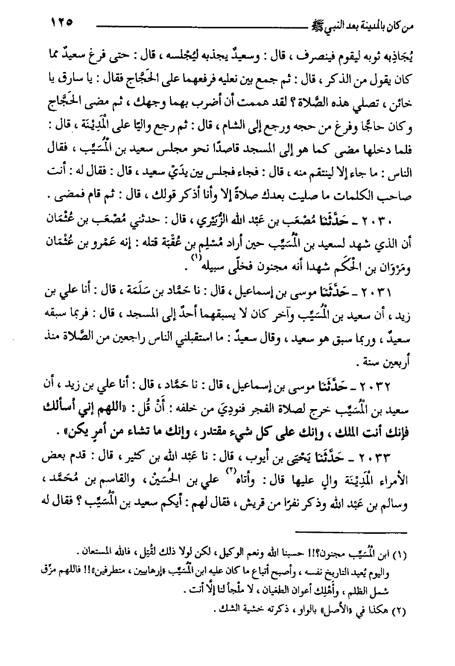 ٢٠٣٠- حَدَّثَنا مُصْعَب بن عَبْد الله الزُّبَيْري، قَالَ: حدثني مُصْعَب بن عُثْمَان أن الذي شهد لسعيد بن الْمُسَيَّب حين أراد مُسْلِم بن عُقْبَة قتله: إنه عَمْرو بن عُثْمَان ومَرْوَان بن الْحَكَم شهدا أنه مجنون فخلي سبيله.