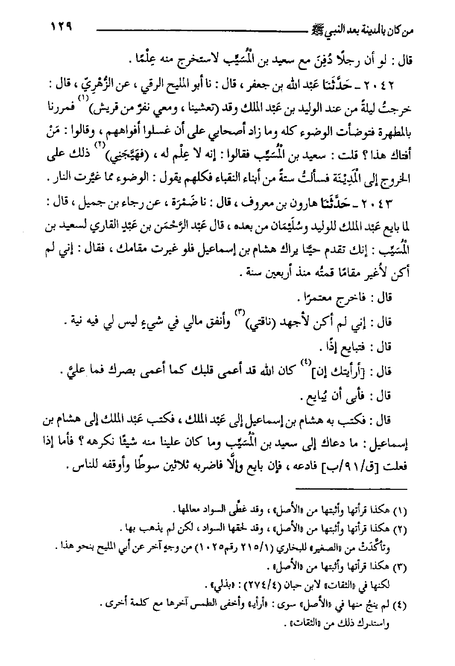 ٢٠٤٣- حَدَّثَنا هارون بن معروف، قال: حَدَّثَنَا ضَمْرَة، عَنْ رجاء بْن جميل، قَالَ: لما بايع عَبْد الملك للوليد وسُلَيْمَان من بعده، قَالَ عَبْد الرَّحْمَن بن عَبْدٍ القاري لسعيد بن الْمُسَيَّب: إنك تقدم حيَّنا يراك هشام بن إسماعيل فلو غيرت مقامك، فقال: إني لم أكن لأغير مقاما قمتُه منذ أربعين سنة.