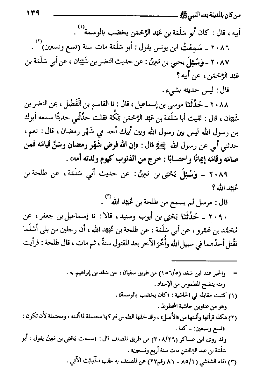 ٢٠٨٩- وَسُئِلَ يَحْيَى بن مَعِيْن: عن حديث أبي سَلَمَة، عن طلحة بن عُبَيْد الله؟ قَالَ: مرسل لم يسمع من طَلْحَةَ بْنِ عُبَيْد اللَّهِ.