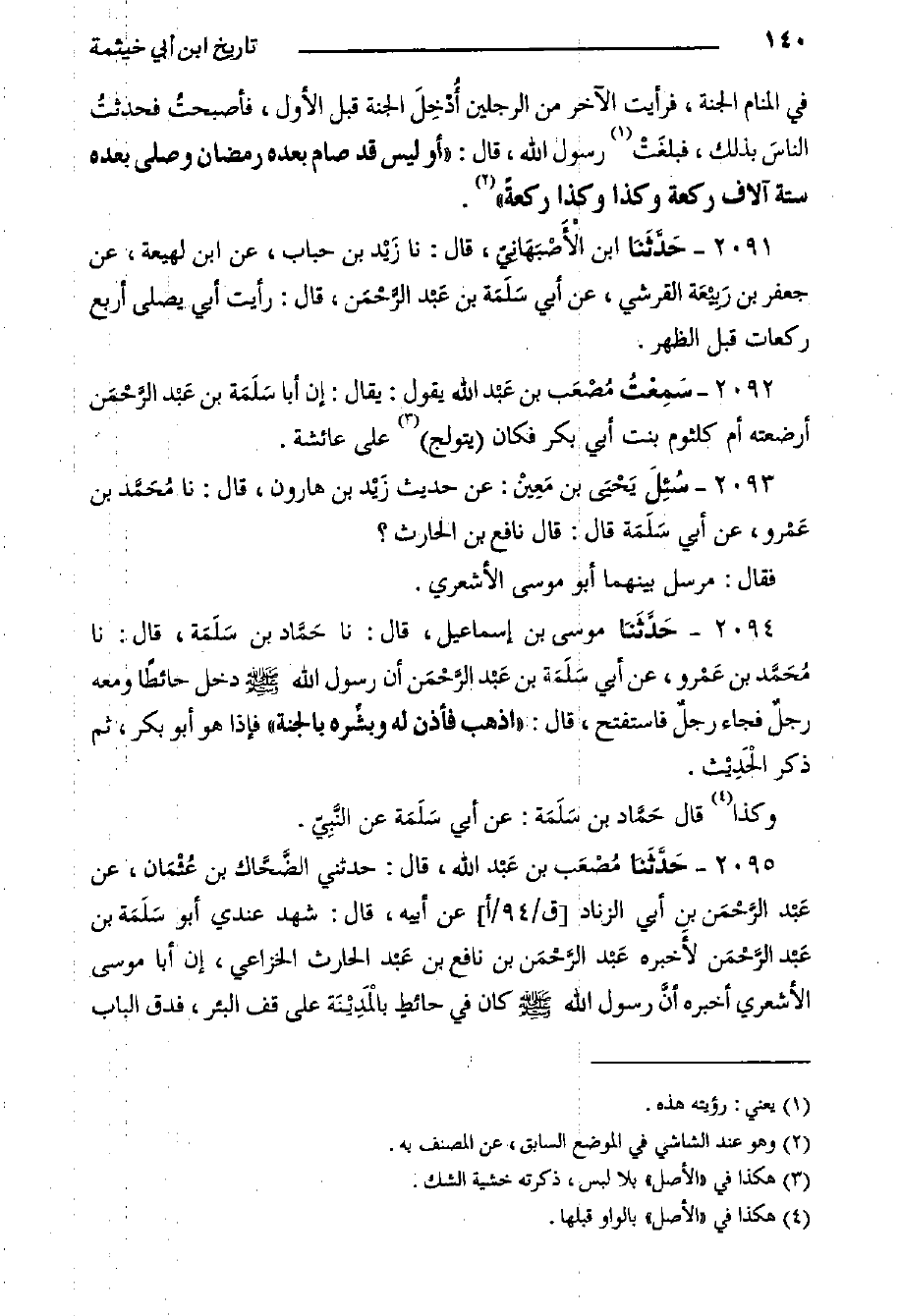 ٢٠٩١- حَدَّثَنا ابْنُ الأَصْبَهَانِيّ، قَالَ: حَدَّثَنَا زَيْد بْنُ حُبَابٍ، عَنِ ابْنِ لَهِيعَةَ، عَنْ جَعْفَرِ بْنِ رَبِيْعَة الْقُرَشِيِّ، عَنْ أَبِي سَلَمَة بْنِ عَبْد الرَّحْمَن، قَالَ: رَأَيْتُ أَبِي يُصَلِّي أَرْبَعَ رَكْعَاتٍ قَبْلَ الظُّهْرِ.